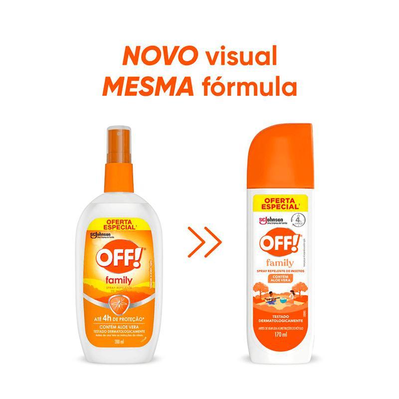 O Repelente Off Family possui fórmula exclusiva que garante proteção contra mosquitos, inclusive contra o aedes aegypti, mosquito que pode transmitir o Zika vírus, a Dengue, a febre Chikungunya e a Febre Amarela. Não oleoso, e fórmula dermatologicamente testado.