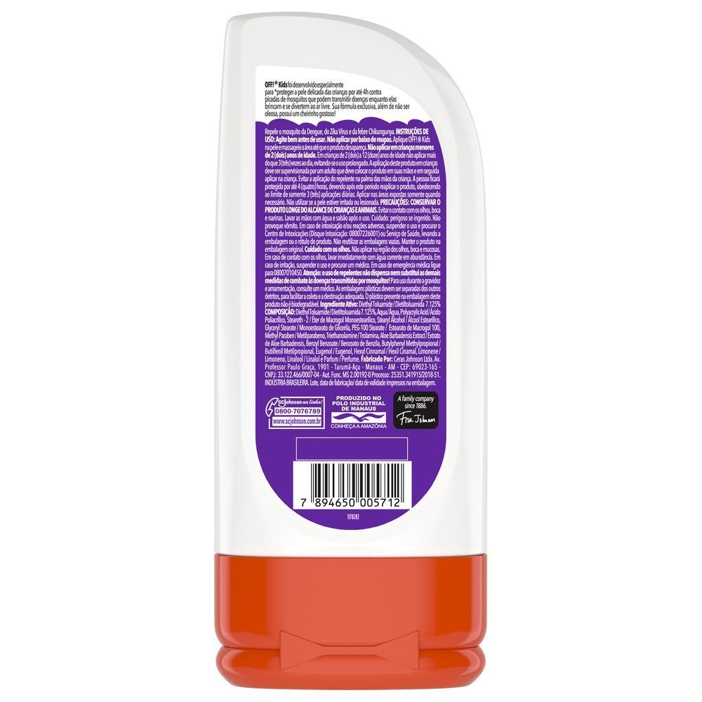 Repelente OFF! Kids Loção 200ml O que é e para que serve o Repelente OFF! Kids Loção? O Repelente OFF! Kids Loção foi desenvolvido especialmente para proteger os pequenos de forma eficaz e delicada. Sua fórmula exclusiva é ideal para a pele sensível das crianças, oferecendo uma defesa confiável contra mosquitos (incluindo o transmissor da Dengue, Zika e Chikungunya). Com este repelente, as brincadeiras ao ar livre, passeios e viagens tornam-se momentos muito mais seguros e livres de preocupações com picadas indesejadas. Proteção Suave para a Pele Sensível Pensado no conforto infantil, o OFF! Kids possui uma textura de loção suave e não oleosa, que é facilmente espalhada e rapidamente absorvida. Ele garante uma aplicação confortável, sem causar irritações, mantendo a pele protegida enquanto as crianças aproveitam cada momento de diversão na natureza, em acampamentos ou no quintal de casa. Principais Benefícios Eficácia Comprovada: Protege contra mosquitos transmissores de doenças; Fórmula Kids: Dermatologicamente testada e segura para a pele sensível; Toque Seco: Loção não oleosa que não deixa a pele pegajosa; Embalagem Econômica: 200ml que rendem muito mais para o cuidado diário; Praticidade: Frasco fácil de transportar em bolsas e mochilas de passeio. Como usar? Aplique a loção sobre as partes expostas do corpo da criança e espalhe uniformemente com as mãos. Para aplicar no rosto: coloque o produto nas mãos de um adulto e espalhe cuidadosamente no rosto da criança, evitando o contato com os olhos, boca e narinas. Não aplique nas mãos das crianças pequenas para evitar que levem o produto à boca ou aos olhos. Dica de Segurança para os Pais Para manter a eficácia, lembre-se de reaplicar o repelente conforme a necessidade ou após contato com água e suor excessivo. A aplicação deve ser sempre realizada ou supervisionada por um adulto, garantindo a cobertura total das áreas expostas. Advertências e Cuidados • Uso externo. Não aplicar sobre pele irritada ou lesionada. • Em caso de irritação, suspenda o uso e procure orientação médica. • Evite o contato com olhos e mucosas. • Lave as mãos após a aplicação. • Mantenha fora do alcance de crianças e animais domésticos.