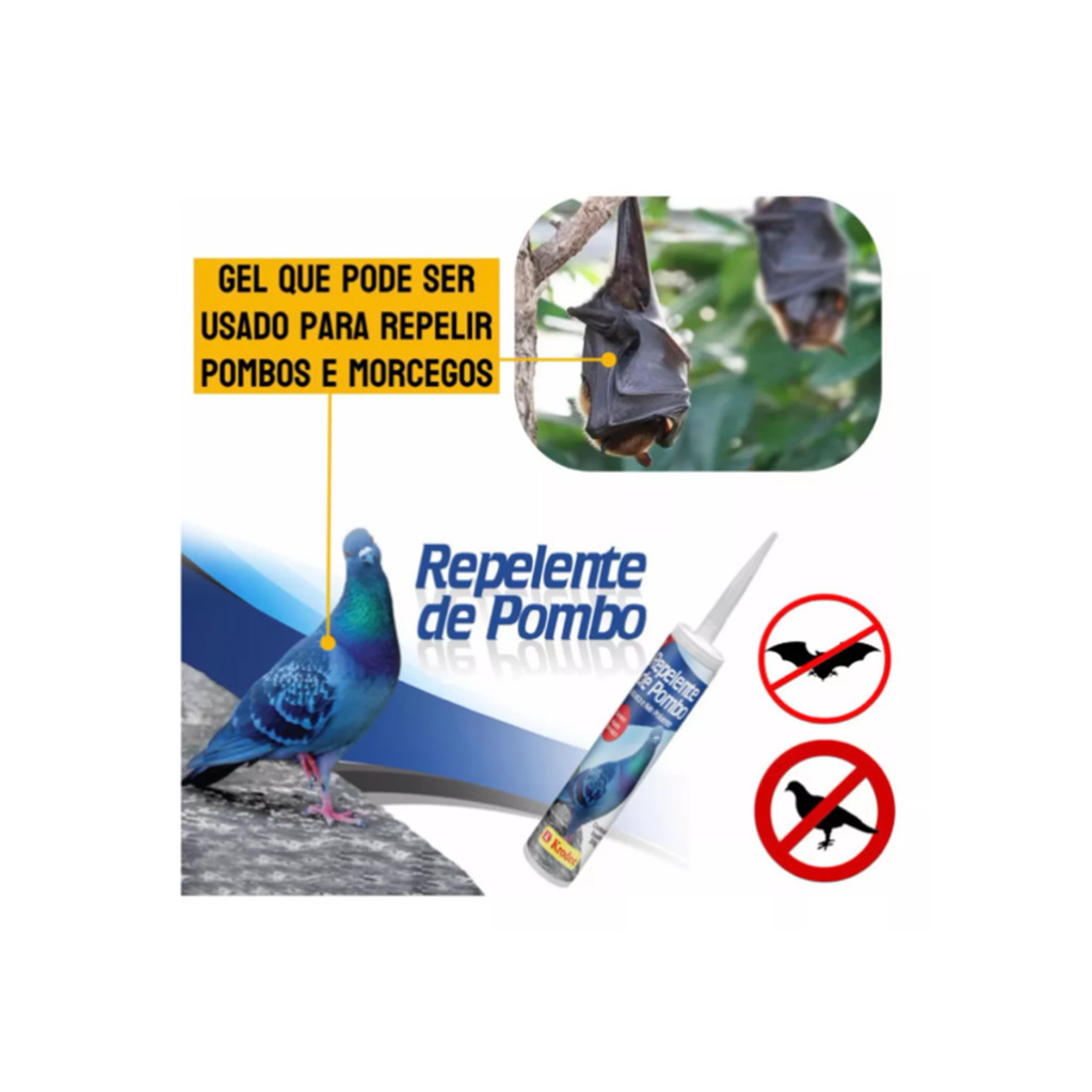 REPELENTE ESPANTA POMBOS E MORCEGOS KRODEC 265G Repelente Pombo Morcego Aves em geral e insetos 300ml em Gel KRODEC Repelente de Pombos KRODEC , é um produto na forma de gel, pronto para uso, formulado para maior durabilidade, mesmo quando exposto às condições ambientais adversas (temperatura, umidade, luz e raios ultravioleta), permanece ativo. Poeiras e sujeiras podem diminuir a característica de pega do produto, caso isso ocorra, remova-o com uma espátula e reaplique. Mecanismo de Ação: Aves - Ao pousarem em locais onde o produto foi aplicado, as aves sentem desconforto físico devido à aderência de suas patas com o produto, e procuram se retirar do local, muitas vezes sinalizando ou advertindo o bando para se manter afastado do local. Formigas - Ao tentar transpor o filete de produto aplicado em forma de barreira, muitas ficam grudadas ao produto, e imediatamente emitem sinais através de feromônios, alertando para o perigo. Outras formigas da colônia evitam o local e desta forma, sem o uso de veneno, pode-se proteger plantas e/ou locais onde as formigas procuram alimentos ou abrigo. Ratos - O mecanismo de ação de repelência dos ratos é similar ao descrito para as formigas, porém as barreiras com o produto devem ser mais largas para evitar que os ratos possam saltar sobre elas. Modo de Usar: Bisnaga 300ml: 1) Cortar o bico da seringa desobstruindo a saída do produto. 2) Rosquear o bico aplicador. 3) Encaixar a seringa na pistola aplicadora. 4) Acionar o gatilho da pistola fazendo pequenos filetes em zig-zag. 5) Com o auxílio de espátula ou um pedaço de madeira, espalhar uniformemente o produto de modo a fazer um filme de aproximadamente 2 a 5 mm de espessura. Balde 5 Litros: Aves - Com o auxílio de uma espátula ou um pedaço de madeira, espalhar uniformemente o produto de modo a fazer um filme de aproximadamente 2 a 5 mm de espessura nas superfícies habitadas pelos pássaros. Formigas - Fazer um filete em forma de barreia em volta das árvores e caules das plantas e demais locais a proteger, na espessura de aproximadamente 2 a 3 mm. Ratos - Siga as mesmas instruções para pássaros, tomando o cuidado de aplicar o produto ao redor do local a proteger dos ratos, não se esquecendo que esta barreira deve ter largura maior para evitar que os roedores possam saltá-la. Registro: 3.01704 (Empresa)* *Produto isento de registro no MS/ANVISA por não conter ingrediente ativo. O produto, devido ao tipo de formulação, só causa incômodo físico aos pombos, repelindo-os do local da aplicação. Apresentação: Seringas de 300mL ou baldes de 5 litros. Antes de usar leia com atenção as instruções do rótulo. IMAGENS MERAMENTE ILUSTRATIVAS MMA FERRAMENTAS