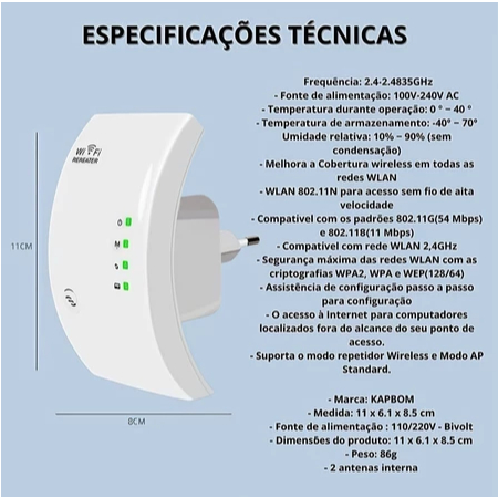 Repetidor De Sinal Wifi 600mbps Bivolt Wireless- N Repeater Expansor de sinal wi-fi Aumente o alcance do seu WiFi utilizando o Repetidor de Sinal WiFi e obtenha uma rede rápida e segura. A velocidade de transmissão é de até 600Mbps e em conformidade com o padrão IEEE 802.11n. A antena do repetidor de sinal possui chips de cerâmica que permite um excelente desempenho. Seu wi-fi distribuí o sinal para toda a casa ou escritório. Tenha um produto de qualidade e de alta velocidade de transferência de dados. Repetidor de Sinal de Internet com botão WPS O "Wireless N WiFi Repeater" recebe o sinal de internet do seu roteador e o amplifica. Você pode ter sinal forte e de qualidade em toda casa ou escritório. Exemplo: Na sua casa ou no seu escritório, o lugar mais distante do roteador recebe um sinal muito fraco ou nem recebe sinal. Instalando o "Wireless N WiFi Repeater" entre o roteador e o ponto mais distante, o sinal será amplificado e você terá a mesma internet como se estivesse ao lado do roteador!