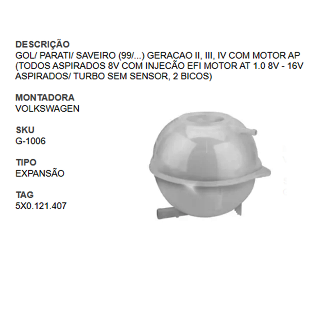 ATENÇÃO TIRE TODAS AS DÚVIDAS ANTES DE EFETUAR A COMPRA! CONFIRME QUANTOS BICOS TEM O RESERVATÓRIO QUE ESTÁ NO CARRO, SE TEM OU NÃO SENSOR, EVITANDO ASSIM COMPRAR O PRODUTO ERRADO E FICAR MAIS TEMPO COM O VEÍCULO PARADO. TIRE SUAS DÚVIDAS NO CAMPO DE COMENTÁRIOS ANTES DE REALIZAR A COMPRA. DESSA FORMA EVITAMOS O TRANSTORNO DE PEÇAS INCORRETAS / DEVOLUÇÕES. -------------------------------------- ESPECIFICACAO DO PRODUTO: GARANTIA: 3 MESES RESERVÁTORIO DE EXPANSÃO + TAMPA DO RESERVATÓRIO DE EXPANSÃO -------------------------------------- CONTEUDO DA EMBALAGEM: - RESERVATÓRIO MARCA:GONEL CODIGO DO PRODUTO: G-1006 CODIGO ORIGINAL: 5X0.121.407 / QUANTIDADE DE SAÍDAS: 02 - TAMPA DO RESERVATÓRIO MARCA: TRINK CODIGO DO PRODUTO: TR-5059 CÓDIGO ORIGINAL: 1H0.121.321.C -------------------------------------- MONTADORA VOLKSWAGEN -------------------------------------- VEICULOS COMPATIVEIS: - GOL 1.0 8V A PARTIR DE 1999, 2000, 2001, 2002, 2003, 2004, 2005, 2006, 2007, 2008 - GOL 1.0 16V A PARTIR DE 1999, 2000, 2001, 2002, 2003, 2004, 2005 - GOL 1.6 8V A PARTIR DE 1999, 2000, 2001, 2002, 2003, 2004, 2005, 2006, 2007, 2008 - GOL 1.8 8V A PARTIR DE 1999, 2000, 2001, 2002, 2003, 2004, 2005, 2006, 2007, 2008 - PARATI 1.0 16V A PARTIR DE 1999, 2000, 2001, 2002, 2003, 2004 - PARATI 1.6 8V A PARTIR DE 1999, 2000, 2001, 2002, 2003, 2004, 2005, 2006, 2007, 2008 - PARATI 1.8 8V A PARTIR DE 1999, 2000, 2001, 2002, 2003, 2004, 2005, 2006, 2007, 2008 - PARATI 2.0 8V A PARTIR DE 1999, 2000, 2001, 2002, 2003, 2004, 2005 - SAVEIRO 1.6 8V A PARTIR DE 1999, 2000, 2001, 2002, 2003, 2004, 2005, 2006, 2007, 2008 - SAVEIRO 1.8 8V A PARTIR DE 1999, 2000, 2001, 2002, 2003, 2004, 2005, 2006, 2007, 2008 - SAVEIRO 2.0 8V A PARTIR DE 1999, 2000, 2001, 2002, 2003, 2004, 2005 ****TODOS G2 / G3 / G4 COM 2 SAÍDAS**** -------------------------------------- - GARANTIA E/OU DEVOLUÇÃO: O PRODUTO É NOVO E COM GARANTIA TOTAL POR NOSSO FORNECEDOR. PARA ISSO GUARDE A NFE QUE EMITIREMOS COM OS DADOS DO USUÁRIO QUE EFETUOU A COMPRA. - NÃO FAZEMOS TROCAS, APENAS DEVOLUÇÕES, QUE SÓ SERÁ POSSÍVEL CASO A EMBALAGEM NÃO TENHA SIDO RASGADA E NEM A PEÇA DANIFICADA. - ESSA GARANTIA NÃO COBRE MAL USO. -------------------------------------- NÃO NOS RESPONSABILIZAMOS POR DEFEITOS OCORRIDOS POR MÁ INSTALAÇÃO DO PRODUTO. TODO O PRODUTO DEVE SER INSTALADO POR UM PROFISSIONAL QUALIFICADO. AS COMPRAS REALIZADAS EM NOME DE PESSOA JURÍDICA ESTÃO SUJEITAS À COBRANÇA DE ICMS, CONFORME PROTOCOLO ICMS 41, DE 4 DE ABRIL DE 2008. CASO VOCÊ TENHA DÚVIDAS SOBRE O PERCENTUAL A SER APLICADO, CONSULTE A CLÁUSULA SEGUNDA, §1° DO REFERIDO PROTOCOLO. FOTOS MERAMENTE ILUSTRATIVAS -------------------------------------- SOBRE A EMPRESA SOMOS UMA EMPRESA ESPECIALIZADA NA VENDA DE PEÇAS AUTOMOTIVAS, COM AMPLA EXPERIÊNCIA NO MERCADO E COMPROMISSO COM A SATISFAÇÃO DE NOSSOS CLIENTES. TRABALHAMOS APENAS COM PRODUTOS NOVOS, DE QUALIDADE E PROCEDÊNCIA GARANTIDA, OFERECENDO SEGURANÇA E CONFIABILIDADE EM CADA COMPRA. NOSSO OBJETIVO É PROPORCIONAR UM ATENDIMENTO ÁGIL, TRANSPARENTE E DE EXCELÊNCIA. EM CASO DE DÚVIDAS, ENTRE EM CONTATO COM A NOSSA EQUIPE — SERÁ UM PRAZER TE ATENDER!