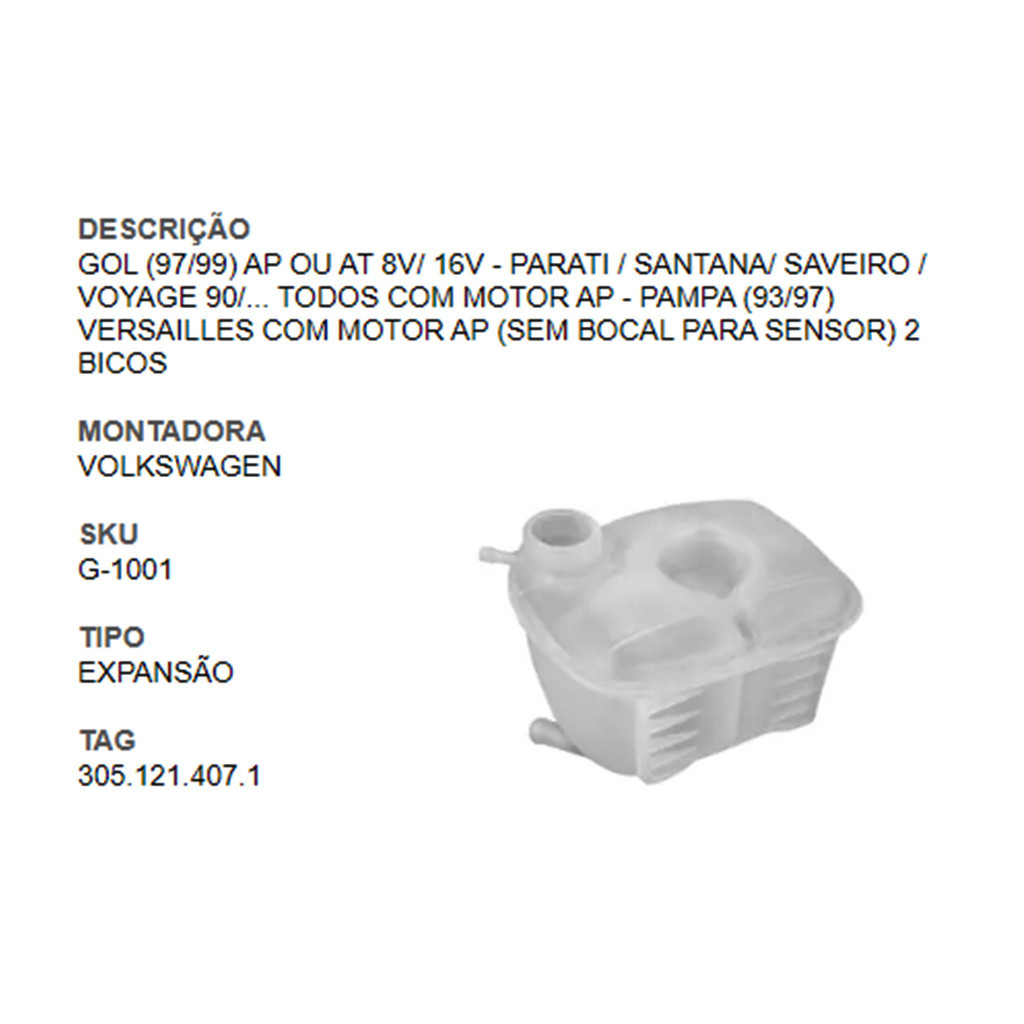 Descrição Marca:Gonel Codigo do Produto: G-1001 ------------------------------------------------------------------------------------------------ ESPECIFICACAO DO PRODUTO: Garantia: 3 Meses Valor Referente a 1 Unidade ------------------------------------------------------------------------------------------------ CONTEUDO DA EMBALAGEM: 01 Reservatorio Expansivo Radiador ------------------------------------------------------------------------------------------------ VEICULOS COMPATIVEIS: MONTADORA VOLKSWAGEN GOL (97/99) AP OU AT 8V/ 16V - PARATI / SANTANA/ SAVEIRO / VOYAGE 90/... TODOS COM MOTOR AP PAMPA (93/97) VERSAILLES COM MOTOR AP (SEM BOCAL PARA SENSOR) 2 BICOS ------------------------------------------------------------------------------------------------ TIPO EXPANSÃO ------------------------------------------------------------------------------------------------ TAG 305.121.407.1