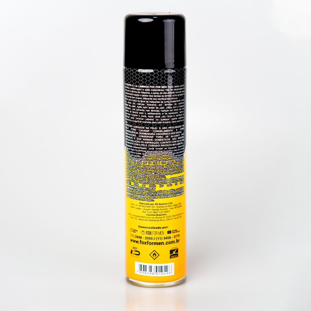 O RESFRI 6.1 de LÂMINAS FOX FOR MEN, limpa, resfria, odoriza, lubrifica, antiferrugem e ação instantânea. Não há necessidade de remover a lâmina da máquina, o spray de alta pressão com jato seco rapidamente expele o cabelo dos dentes da lâmina, outra vantagem é seu aroma bem suave, diferente dos lubrificantes comuns. Serve para todos os tipos de máquinas de corte, acabamento e tosa de todas as marcas inclusive em lâminas de cerâmica. Modo de usar: Agite bem antes de usar. Utilize com a máquina desligada. Use somente nas lâminas. Aplique um breve jato nos dentes da lâmina para o resfriamento e se necessário, repita o processo durante o corte. Após cada uso, limpe e lubrifique as lâminas para remover cabelos ou qualquer sujeira orgânica. Mantendo a superfície molhada para total limpeza. Deixe secar ao ar livre. ATENÇÃO! CUIDADOS NA PELE: O USO PROLONGADO NA PELE PODE CAUSAR CONGELAMENTO E COMO CONSEQUÊNCIA, QUEIMADURA CRIOGÊNICA NOS DEDOS. PRECAUÇÕES: CONSERVAR FORA DE ALCANCE DAS CRIANÇAS E DOS ANIMAIS DOMÉSTICOS. NÃO INGERIR. EVITAR INALAÇÃO OU ASPIRAÇÃO, CONTATO COM OS OLHOS E CONTATO COM A PELE. CUIDADO! PRODUTO INFLAMÁVEL. Recipiente pressurizado: pode romper se aquecido. Mantenha longe do fogo e superfícies aquecidas. Não fume. Em caso de contato com os olhos e a pele, lave imediatamente com água em abundância. Em caso de ingestão, não provoque vômito e consulte imediatamente o Centro de Intoxicações ou o médico, levando o rótulo do produto. Nunca ofereça nada por via oral a uma pessoa inconsciente. Mantenha o produto em sua embalagem original. Não reutilize a embalagem vazia para outros fins. Descarte o produto de acordo com as normas locais. Mantenha o recipiente fechado em local ventilado. Não perfure a embalagem vazia. Não jogue no fogo ou incinerador. Não exponha à temperatura superior a 50°C. COMPOSIÇÃO: polidimetilsiloxano, solventes, aditivo, conservante, antioxidante, fragrância, veículo, butano e propano como propelente. R3 Quimica LTDA CNPJ: 01.197.462/0001-03 Estrada do Bom Jesus, 300 Bairro Lagoa - Vargem Grande Paulista - CEP: 06730-000 AUT. FUNC. 2.09.940-1 INDUSTRIA BRASILEIRA RESP. TEC. ALEXANDRE BATISTA DA SILVA CRQ-IV: 04.267.461 Produto Notificado na Anvisa Processo nº: 25351.584105/2021-92