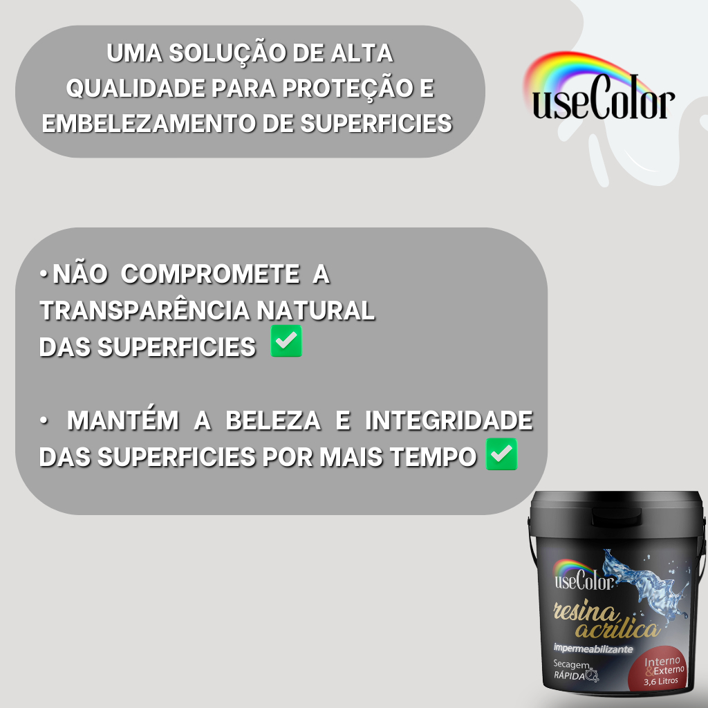 UMA SOLUÇÃO DE ALTA QUALIDADE PARA PROTEÇÃO E EMBELEZAMENTO DE SUPERFICIES • NÃO COMPROMETE A TRANSPARÊNCIA NATURAL DAS SUPERFICIES • MANTÉM A BELEZA E INTEGRIDADE DAS SUPERFICIES POR MAIS TEMPO ___________________________________________________________________________________________________ •A RESINA ACRÍLICA IMPERMEABILIZANTE DA USECOLOR POSSUI → SECAGEM RÁPIDA ✅ →ÓTIMA ADERÊNCIA ✅ → ACABAMENTO BRILHANTE ✅ 💧EMBALAGEM RENDIMENTO: Galão (3,6 L): 230 m2/ demão. DILUIÇÃO: Não é necessário, produto pronto para uso. APLICAÇÃO: Rolo de lã, trincha ou pistola. SECAGEM: •TOQUE: 30 minutos •ENTRE DEMAOS: 4 horas •FINAL: 120 horas •CURA TOTAL: 7 dias ___________________________________________________________________________________________________ PREPARAÇÃO DE SUPERFICIE: Antes de iniciar a aplicação, seguir as orientações abaixo: ->A superfície deve estar firme ,coesa, limpa, seca, sem poeira, gordura, graxa, sabão, umidade ou mofo. ->Onde forem identificados microrganismos (bolor,fungo), lavar as superfície com uma solução de água potável e água sanitária na proporção de 1:1, deixando essa solução agir por cerca de 30 minutos ,no mínimo. ->Enxaguar e aguardar a secagem ->Partes soltas ou mal aderidas, devem ser raspadas /lixadas e corrigidas adequadamente antes do processo de pintura
