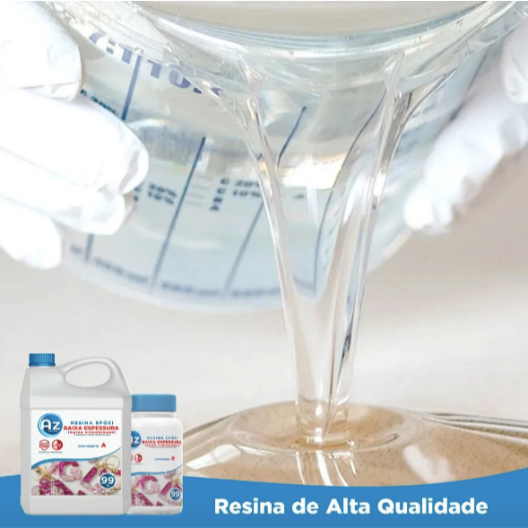 A Resina Epóxi AZ foi desenvolvida para quem busca qualidade e acabamento impecável em suas criações. Ela é perfeita para uso em madeira, além de criações de peças como chaveiros personalizados, marcadores de página, peças de dominó, canetas resinadas e muito mais. Sua baixa viscosidade garante aplicação fácil, penetração uniforme nos moldes e superfícies lisas. Com pureza química de 99,99%, entrega transparência cristalina e resistência superior, sem impurezas. Ideal para peças de até 3 cm de espessura, oferecendo resultados profissionais em cada criação. Produto 300g Componente A (Resina): 200 g Componente B (Endurecedor): 100 g Modo de Preparo: Utilize sempre 50% de endurecedor em relação à quantidade de resina. Exemplo: ao utilizar 100 g de resina, adicione 50 g de endurecedor. Em um recipiente limpo, adicione o Componente B (endurecedor) sobre o Componente A (resina). Misture bem os componentes por aproximadamente 5 minutos, até obter uma massa homogênea. Após a mistura, despeje todo o conteúdo do recipiente sobre a superfície desejada e utilize imediatamente. * Vantagens da Resina de Baixa Espessura * Maior fluidez: penetra facilmente em moldes e detalhes finos. * Acabamento cristalino: garante transparência e brilho intenso. * Perfeita para pequenas peças: ideal até 3 cm de espessura. * Alta pureza química: sem bolhas, manchas ou amarelamento precoce. * Secagem uniforme: evita falhas e retrações na cura. * Versatilidade de uso: chaveiros, canetas, marcadores, bijuterias, dominós e muito mais. * Fácil aplicação: mistura homogênea, simples de preparar. * Durabilidade: resistência superior contra riscos e impactos leves. * Sistema anti-blushing e proteção UV: maior estabilidade contra umidade e luz solar. * Rendimento elevado: cobre mais área com menos produto. palavras chave * resina epóxi * resina baixa espessura * resina transparente * resina cristal * resina artesanato * resina chaveiro * resina marcador de página * resina caneta personalizada * resina bijuteria * resina mesa decorativa * resina dominó * resina artística * resina madeira * resina ultra brilho * resina 99,99% pureza * resina fácil aplicação * resina acabamento premium * resina brilho intenso * resina moldes pequenos * resina peças detalhadas