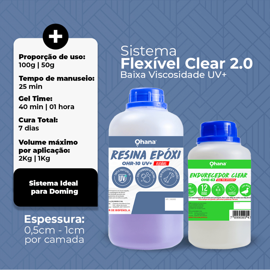 ** CONTÉM MANUAL DO APLICADOR E DICAS IMPORTANTES ** DESCRIÇÃO: - Resina Epóxi Flexível UV+ (200g) com Endurecedor Clear (100g). Total de 300 g de mistura Um sistema de resina epóxi de baixa viscosidade para aplicações superficiais com baixa espessuras. Ideal Para Brinde, Adesivos , sendo uma resina ideal para Nào deixar o filme amarelar Resina Epóxi Flexível é uma resina epoxídica que reagindo com os endurecedores específicos forma um filme flexível. Mantém sua flexibilidade por um período indeterminado EXEMPLOS DE APLICAÇÃO: - Adesivos - Trofeus - Medalhas - Artesanatos - Bijuterias - Construção Civil - Embarcações VANTAGENS: - Excelente transparência e boa retenção de cores - Boa fluidez - Facilidade de Processamento - Resistência química elevada, especialmente ao intemperismo e umidade - Estabilidade aos ciclos térmicos, impactos e ações mecânicas. - Boa adesão. Alta dureza e resistência à abrasão - Fácil impregnação na aplicação em laminação INFORMAÇÕES ÚTEIS: - Proporção de 100% de Resina Para 50% de Endurecedor .Ou seja, 100g Res. Para 50g End.; - Alta resistência química; - Alta resistência mecânica se utilizada com Fibras; - Baixa contração. - Deixar a Resina sempre curando em temperatura ambiente maior que 18°C - Aplicações de camadas de até 0,5 cm de espessura;