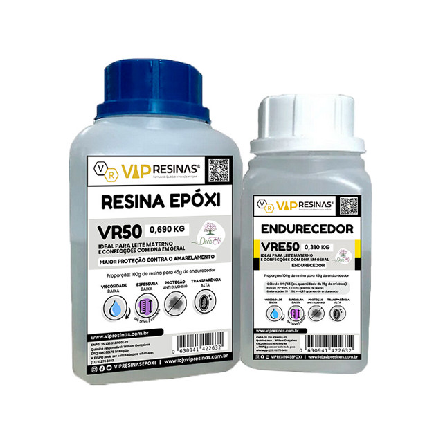 Descrição geral: A Resina Epóxi Para Joias Afetivas VR50 é um produto de alta qualidade, desenvolvido como uma solução bi componente para aplicações que requerem um acabamento vítreo e transparente de alto brilho. Essa resina é especialmente projetada para oferecer máxima resistência ao amarelamento, tornando-a ideal para a confecção de jóias afetivas, com foco em peças que incorporam leite materno como material de destaque. Este kit acompanha: Uma resia (componente A) de 690g e (endurecedor componente B) de 310g Versatilidade e qualidade: Alta Transparência: A VR50 - ULTRALIGHT apresenta um sistema de alta transparência, garantindo que suas criações tenham um aspecto vítreo e cristalino. Baixa Viscosidade: Sua baixa viscosidade facilita o manuseio e a aplicação, permitindo que você crie peças de alta qualidade com facilidade. Resistência Mecânica: Esta resina oferece boa resistência mecânica, tornando suas peças mais duráveis e menos propensas a danos por impacto. Excelente Aderência: A VR50 - ULTRALIGHT possui ótima adesão a uma variedade de superfícies, garantindo a fixação segura de elementos incorporados em suas criações. Proteção UV Avançada: Destaca-se pela ultra proteção UV, proporcionando uma resistência excepcional ao amarelamento ao longo do tempo, preservando a beleza e a clareza das suas criações. Proporção e tempo de uso: Para obter os melhores resultados ao trabalhar com a Resina Epóxi Para Joias Afetivas VR50, siga estas orientações: Proporção 100/45: Misture os componentes da resina de acordo com as instruções do fabricante para garantir uma cura eficaz e resultados consistentes. Tempo de Secagem a 25°C: A resina VR50 - ULTRALIGHT seca em camadas de 2mm em um período de 6 a 8 horas. Isso se aplica até mesmo a moldes de pequenas dimensões. Vitrificação Final a 25°C: Para alcançar a vitrificação final da resina em camadas de 2mm, aguarde um período de 24 a 36 horas. INSTRUÇÕES DE APLICAÇÃO: Certifique-se de seguir rigorosamente as instruções de aplicação fornecidas pelo fabricante para obter os melhores resultados. Isso inclui a preparação adequada da superfície, a mistura correta dos componentes e o controle do tempo de secagem e vitrificação. A Resina Epóxi Para Joias Afetivas VR50 é a escolha ideal para artesãos e joalheiros que buscam criar peças vítreas, resistentes e duráveis, especialmente em projetos que incorporam o valor sentimental do leite materno. Sua alta qualidade e propriedades únicas a tornam uma opção confiável para a produção de jóias afetivas e biojóias que resistem ao teste do tempo, mantendo sua beleza e brilho.