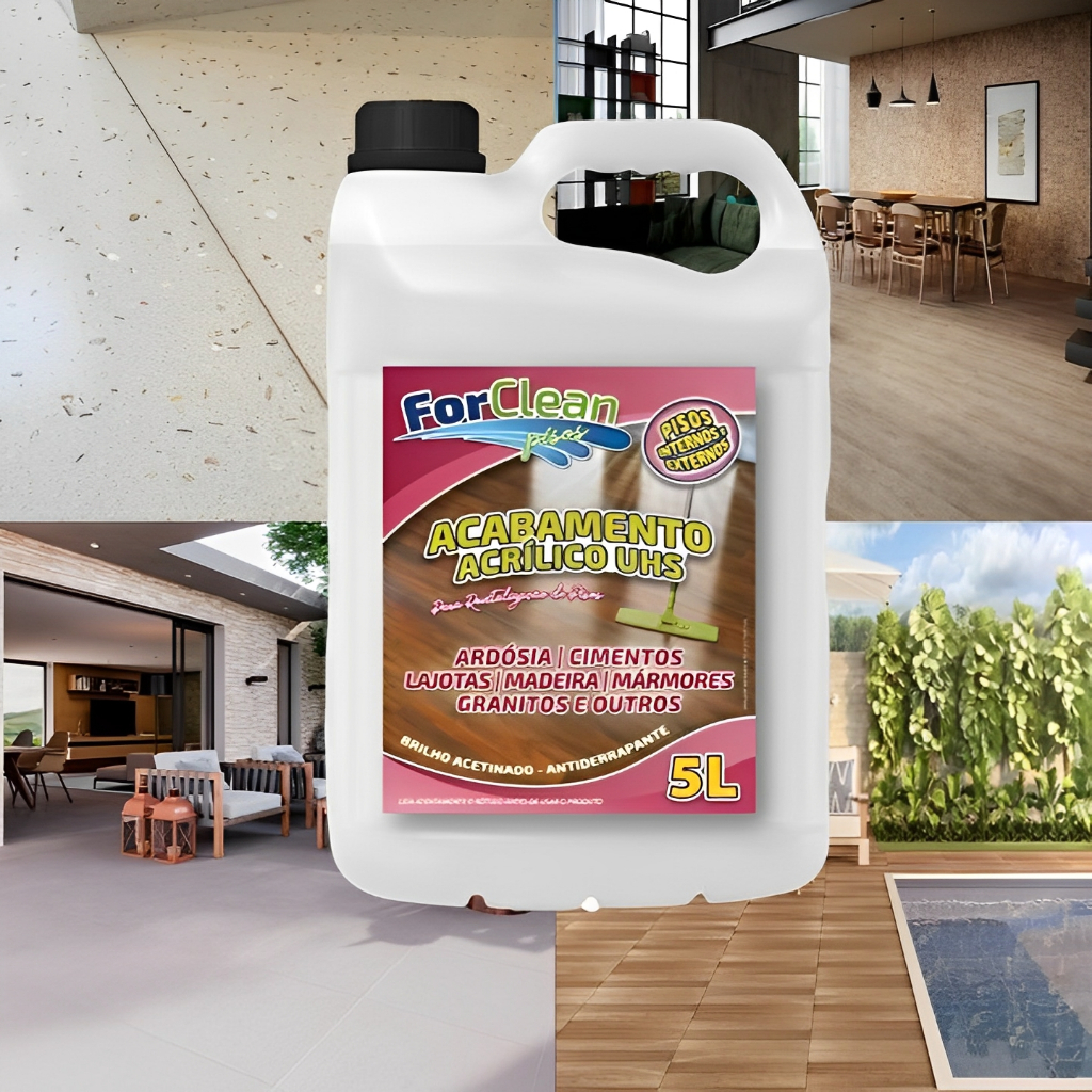 1 GALÃO DE RESINA ACRÍLICA IMPERMEABILIZANTE UHS FOR CLEAN PISOS INTERNOS E EXTERNOS INCOLOR BRILHANTE De secagem rápida à base de água sem cheiro. Impermeabiliza, protege, ótimo acabamento e brilho em pisos internos e externos. A RESINA ACRÍLICA UHS da For Clean Pisos é um produto pioneiro no mercado, sendo considerado um dos melhores do Brasil. Produto de alto desempenho, ecologicamente correto, que pode ser aplicado em diversos tipos de superfícies. Residencial – Comercial- Industrial TAIS COMO: Paredes, pedras, pisos, superfícies, ardósia, assoalhos, cerâmicas, Cimentos: queimado, Marmorite, granilite, granitina, industrial, concreto, lajota, laminados granitos, mármores, paviflex, madeira, porcelanatos etc. MODO DE USAR: • PISOS INTERNOS: aplicar de forma uniforme 2 a 3 camadas. • PISOS EXTERNOS: aplicar de forma uniforme 4 a 5 Ou mais camadas. APLICAÇÃO: • usar aplicador de espuma, pano, mop. Rendimento: 1 litros/demão: até 50m² • Usar em Pisos novos de Cimentos, Lajotas ou Madeira. Rolo de pelo curto. Rendimento: 1 litro/demão: até 30m². TEMPO DE SECAGEM: •. Ao toque: 15/20 minutos. Entre demãos: 30 • Diluição: pronta para uso. O QUE VOCÊ PRECISA SABER SOBRE ESSE PRODUTO o Acabamento: Brilho o Cor: Água o Peso líquido: 5 kg o Volume líquido: 5 L o De fácil aplicação o Base líquida o Secagem: 15/20 Minutos. o Produto recomendado para: Pisos e superfícies internas e externas. TIPO DE ACABAMENTO ACRÍCO UHS: • *Ação Fungicida • *Maior retenção de brilho • *Maior resistência e durabilidade • *Alto poder de impermeabilização • *Suporta Sol, Chuva, Auto tráfego pesado e intempéries. ESTE PRODUTO NÃO DEVE SER APLICADO EM PISOS E SUPERFÍCIES NOVOS ESMALTADOS OU VITRIFICADOS.