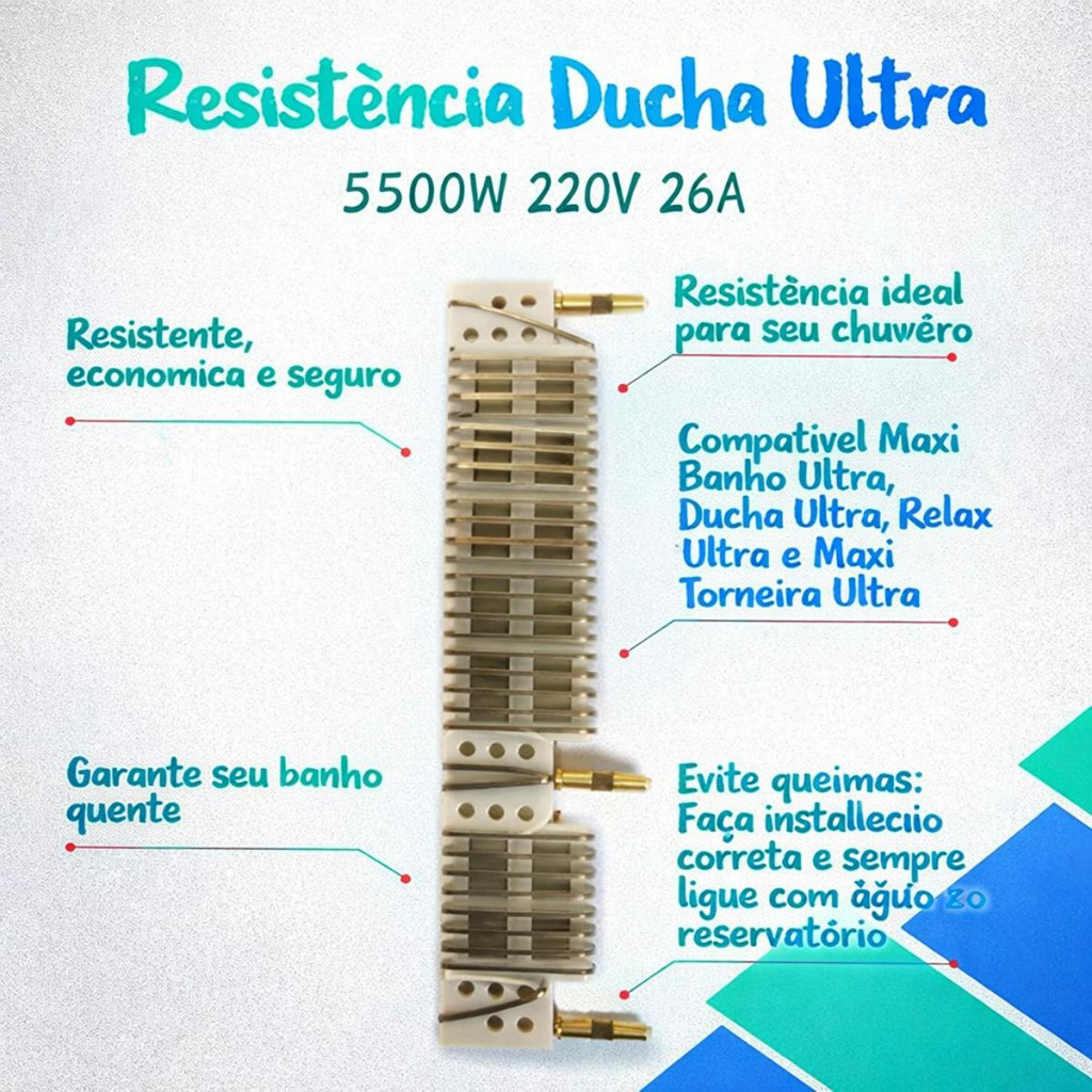 Resistência indicada para Chuveiro Ultra Lorenzetti - 5.500W - 220V – 26A Garanta um banho sempre quente e agradável com a resistência elétrica ideal para o seu chuveiro. Peça essencial para o funcionamento do aquecimento, ela é responsável por transformar a energia elétrica em calor, proporcionando aquele banho relaxante, mesmo nos dias mais frios. Fabricada com materiais de alta qualidade, oferece excelente desempenho, durabilidade e segurança. Fácil de instalar, é a escolha certa para quem busca reposição confiável e eficiente. Compatível com os modelos Lorenzetti: - Maxi Ducha - Maxi Banho Ultra - Bello Banho Ultra - Maxi Ducha Ultra - Relax Ducha Atenção: Não compatível com o modelo Bella Ultra. Informações Técnicas: - Potência: 5.500W - Voltagem: 220V - Corrente: 26A - Modelo: Resistência Chuveiro Ultra Lorenzetti - Fiação Mínima: 4mm² Instruções de troca: 1- Desligue a energia elétrica. 2- Mantenha a chave seletora na posição fria. 3- Abra o chuveiro com cuidado. 4- Substitua a resistência danificada. 5- Antes de ligar a energia, deixe correr água fria por alguns segundos até que saia água continuamente (sem ar). Somente após esses passos, ligue a energia elétrica.