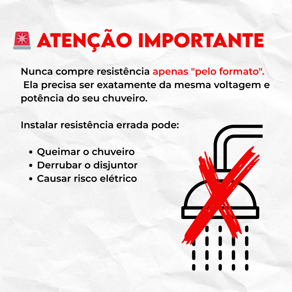 Dados Técnicos: Marca: Pratimix Material: Ligas metálicas de cobre e aço; termoplástico. Voltagem: 127v Potência: 5500w Dica: Para sua maior segurança e maior vida útil da resistência, selecione as teclas liga/desliga e seletora de temperatura somente com o registro fechado. *Imagens meramente ilustrativas* Agradecemos a sua visita e estamos à disposição. Resistencia Pratimix 127v 5500w 8T