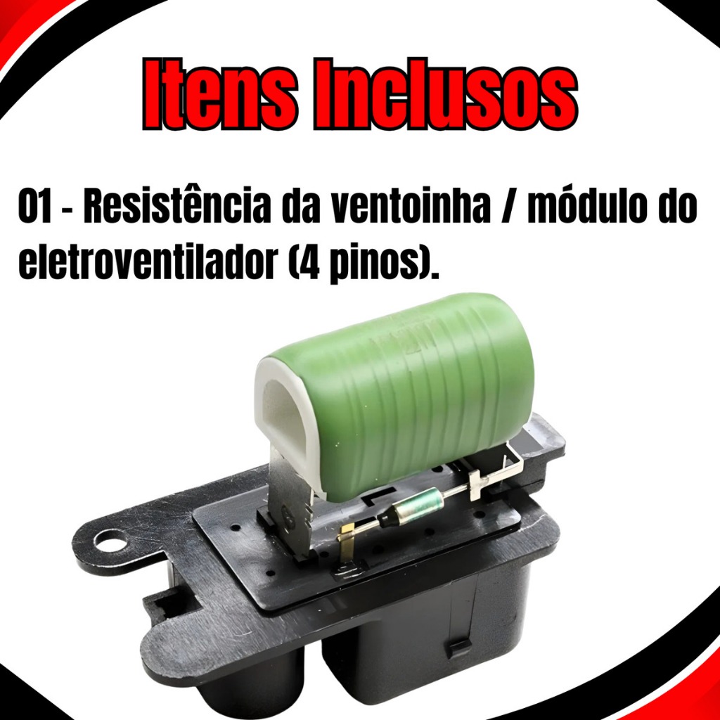 Resistência Ventoinha Gol Fox Polo Saveiro Voyage G5 G6 G7 MQ1039 Full A resistência da ventoinha (módulo do eletroventilador) é responsável por controlar as velocidades de funcionamento da ventoinha do radiador, auxiliando na refrigeração do motor e mantendo a temperatura ideal de trabalho, evitando superaquecimento e falhas no sistema de arrefecimento. Material: Corpo em plástico de alta resistência com elemento resistivo interno (cerâmica/metal) Código da peça: MQ1039 Marca: Full CONTEÚDO DA EMBALAGEM: 01 - Resistência da ventoinha / módulo do eletroventilador. APLICAÇÃO: Compatível com: Fox 1.0 / 1.6 – 2008 em diante Gol 1.0 / 1.6 – 2008 em diante Saveiro 1.6 / 1.8 – 2008 em diante SpaceFox 1.6 – 2008 em diante Polo (manual/flex) – 2008 em diante Garantia do vendedor: 30 dias