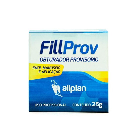 Embalagem com 1 pote de 25g. Detalhes Restaurador Provisório Fillprov – Allplan O Fillprov da Allplan é um restaurador provisório formulado para proporcionar vedamento eficaz, manuseio simples e remoção facilitada. Ideal para selamento temporário de cavidades em procedimentos de endodontia, prótese e dentística, o produto não contém eugenol, o que o torna compatível com diversos materiais restauradores e medicamentos intracanais. Principais Características Consistência ideal para aplicação precisa e adaptação na cavidade. Fácil de manipular, aplicar e remover. Vedamento marginal eficiente, prevenindo infiltrações. Isento de eugenol, evitando interferência com medicamentos intracanais. Impede a migração de substâncias da câmara pulpar para o meio bucal. Uso exclusivo por cirurgiões-dentistas. Não deve ser utilizado como cimento restaurador definitivo. Armazenamento: manter em local limpo, seco, longe da luz. Após o uso, manter o frasco bem fechado. Registro ANVISA: 80954610004 Aplicação Indicações O Fillprov é indicado para: Obturação provisória de cavidades em procedimentos endodônticos. Selamento temporário em tratamentos protéticos e restauradores. Sua formulação garante adesão segura às paredes dentárias, evitando a contaminação por fluídos bucais e o risco de infiltração bacteriana durante o período de tratamento. Instruções de Uso Certifique-se de que o local de aplicação esteja limpo e seco. Aplique a quantidade desejada do produto com o auxílio de uma espátula. O tempo de presa (endurecimento inicial) é de 3 a 5 minutos. A cura completa ocorre entre 15 e 30 minutos. O endurecimento se dá ao entrar em contato com saliva ou água.