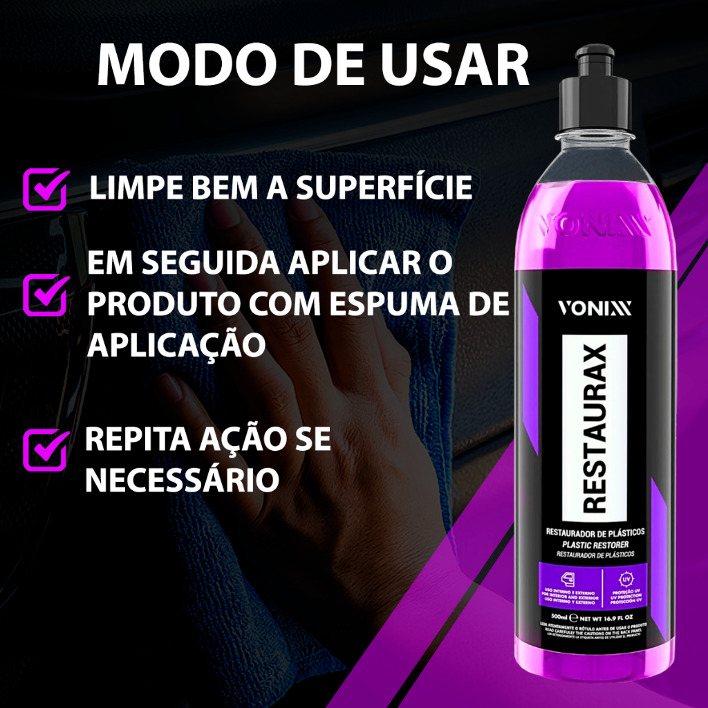 Restaurax renova e restaura superfícies plásticas, como para-choques, painés e laterais de portas. Sua fórmula contém polímeros especiais que também protegem as peças contra as ações do tempo, evitando degradação prococe do material - FICHA TÉCNICA: - Valor referente ao kit - Aplicador de espuma Zacs incluso - Renova e dá brilho - Protege contra a ação do tempo - Contém polímeros de última geração - MODO DE USAR: Limpar bem a superfície e em seguida aplicar o produto com um aplicador de espuma até a completa restauração. Se necessário, repetir a operação. Para manter o plástico sempre novo, repetir a aplicação do produto a cada 60 dias na parte externa e a cada 6 meses na partee interna Obs: Para um resultado com menos brilho, realizar acabamento com uma microfibra PERGUNTAS FREQUENTES: 1). OS PRODUTOS SÃO NOVOS? Sim, todos os nossos produtos são novos. 2) MINHA COMPRA É SEGURA? Sim, todas as transações realizadas dentro da plataforma do mercado livre são seguras, e garante seu estorno em caso de problemas com o produto. 3) O PRODUTO TEM GARANTIA? Oferecemos 3 meses de garantia para os defeitos de fabricação. 4) O PRODUTO TEM NOTA FISCAL? Sim, todos nossos produtos acompanham Nota Fiscal, enviada de acordo com as informações do cadastro do comprador. 5) POSSO REALIZAR TROCA OU DEVOLUÇÃO? Sim, de acordo com os termos, você pode devolver ou trocar seu produto em caso de embalagem violada, avarias e itens faltando na embalagem que não está de acordo com seu pedido em até 7 dias após o recebimento. 6) QUANDO É FEITO O ENVIO? Todos os envios são realizados dentro de 24 horas após a compra, exceto nas compras aos sábados e domingos e feriados. CÓD. REFERÊNCIA: 019345
