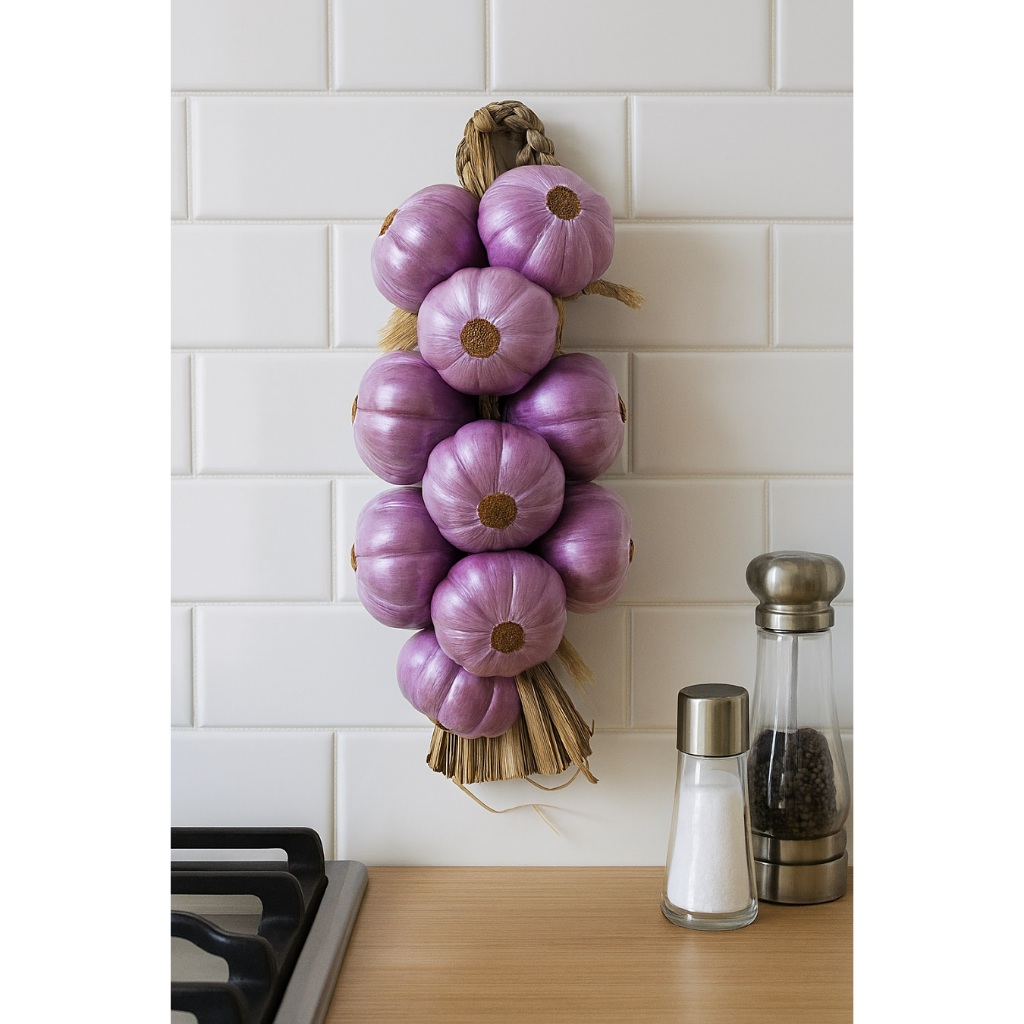 Dimensões aproximadas: comprimento: entre 30-35cm Contém 9 cabeças. Peso liquido: 300 gramas aprox. Material: trança de palha natural, cabeça de pó de madeira. Características: -Trança feita com palha natural na mão. -Ideal para decoração de cozinhas, churrasqueiras, restaurantes, fazendas, espaços rústicos, feiras livres, áreas gourmets, foodtrucks, festas temáticas, entre outros ambientes. -Material e acabamento de primeira qualidade. -Produto artesanal, feito a mão.