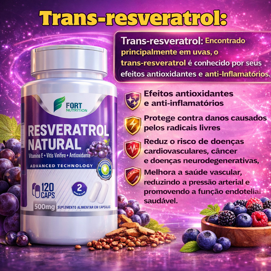 O Resveratrol é um poderoso antioxidante natural, amplamente utilizado por pessoas que buscam proteção celular, equilíbrio do organismo e qualidade de vida ao longo do tempo. Extraído de fontes naturais, o resveratrol auxilia no combate aos radicais livres, contribuindo para a manutenção da saúde e do bem-estar diário. ✅ Principais Benefícios ✔ Ação antioxidante natural ✔ Auxilia na proteção das células contra radicais livres ✔ Contribui para o equilíbrio do organismo ✔ Apoia a saúde cardiovascular* ✔ Ideal para uso diário *Auxilia como parte de uma rotina saudável. 🌿 Ingrediente Ativo Resveratrol 🔬 Diferenciais da Fórmula ✔ Alta concentração ✔ Cápsulas práticas ✔ Fórmula premium ✔ Não contém glúten 📦 Informações do Produto Conteúdo: 60 cápsulas Dosagem: 500mg por cápsula Forma: Cápsulas Suplemento alimentar Uso adulto ⚠️ Este produto não é medicamento. ⚠️ Não substitui uma alimentação equilibrada e hábitos saudáveis.
