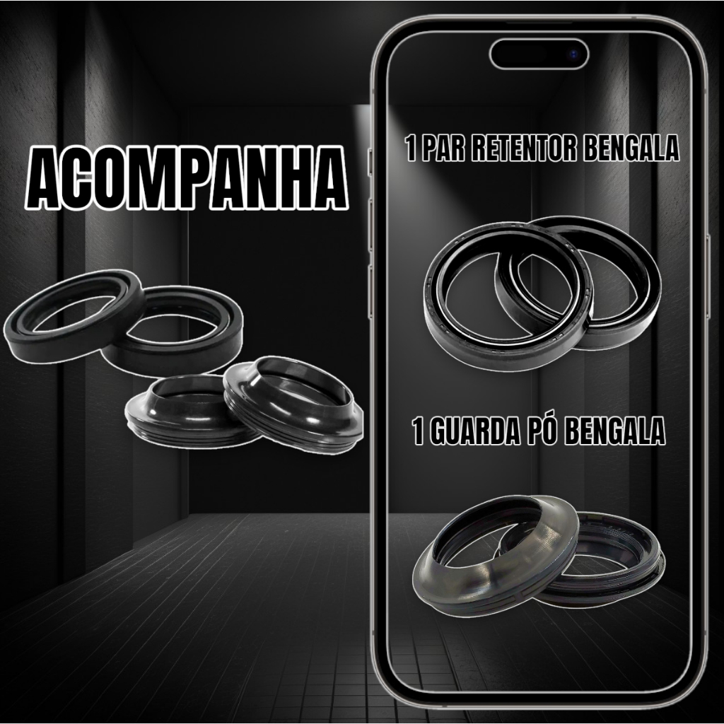 RETENTOR BENGALA + GUARDA PÓ ITENS DO KIT: 1 PAR RETENTOR BENGALA 1 PAR GUARDA PÓ BENGALA COMPATÍVEL COM: • DAFRA NH190 (2020 ATÉ 2026) • DAFRA NHX 190 ( 2025 ATÉ 2026) MARCAS: • RETENTOR : EMBUS / CATIMOTO / NATION / MOTOPORT • GUARDA PÓ : EMBUS / CATIMOTO / NATION / MOTOPORT MARCAS PODEM VARIAR A DEPENDER DO ESTOQUE DISPONÍVEL NO MOMENTO. PRODUTO A PRONTA ENTREGA