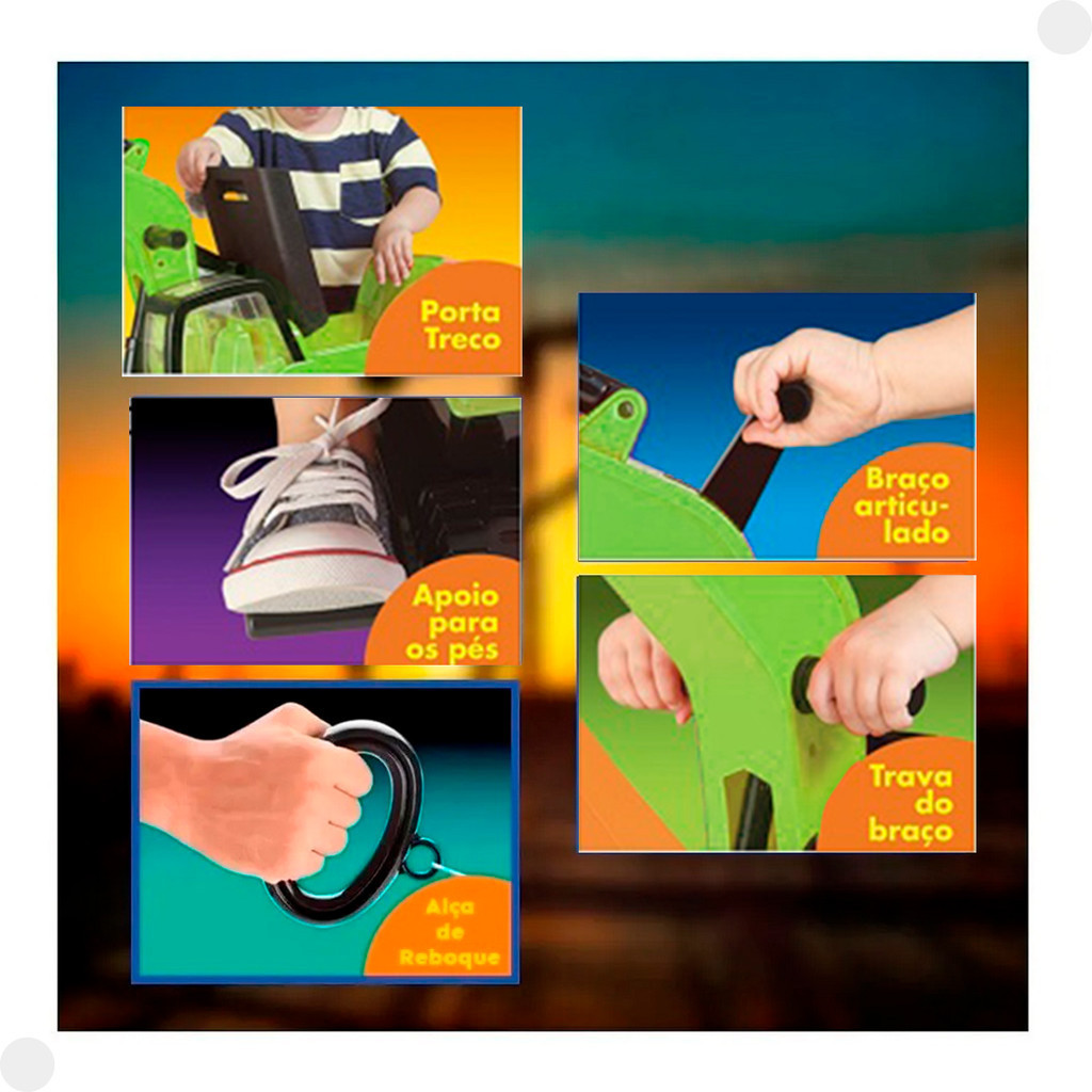 DESCRIÇÃO DO PRODUTO A Giant Escavator é a escavadeira feita em plástico resistente (PVC de alta resistência), que vai proporcionar momentos de pura diversão para a criançada. Esta escavadeira movimenta-se quando a criança impulsiona os pés no chão ou quando é puxado por um adulto, possui pedal para apoio dos pés da criança. A escavadeira gira para direta e esquerda, o braço e a pá são controlado por manivelas. Vem com porta treco e alça para reboque (não incluso a corda). Indicado para crianças de 3 a 7 anos e suporta crianças de até 50kg. Deixe a brincadeira ainda mais divertida com Giant Escavator! Tamanho: 62cm de comprimento, 39cm de largura e 54,5cm de altura. INDICADO PARA CRIANÇAS DE 3 A 7 ANOS ATÉ 50KG. CARACTERÍSTICAS TÉCNICAS Conteúdo da Embalagem: 1 Escavadeira Dimensões da Embalagem: 31,0 x 48,0 x 48,0cm (Alt. x Larg. x Compr.) Material: Plástico Idade Mínima Recomendada : 4 anos Alimentação: Não se Aplica Marca: Roma Referência: 1783 Outras informações: As cores podem variar entre as imagens mostradas acima e o produto. Imagens meramente ilustrativas. Aviso: As informações e imagens divulgadas são de total responsabilidade do fabricante/fornecedor. Produto lacrado e disponível a pronta entrega para todo Brasil! APROVADO PELO INMETRO