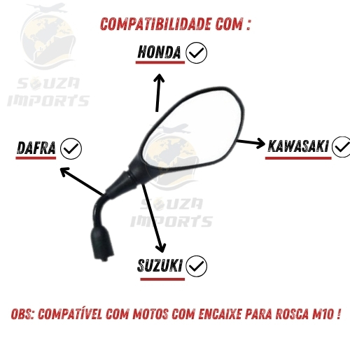 🚀Retrovisor Bmw F800 Moto Honda Fixo Haste Curta Par🚀 ▪Compatibilidade: ✅ Dafra ✅ Kawasaki ✅ Suzuki ✅ Honda ▪ Observação: Compatível com motos que possuem encaixe para rosca M10. 🎨 Cor Disponível: ▪ Preto 🔧 Especificações Técnicas: ▪ Modelo Similar: BMW GS 650 e F800 ▪ Hastes Resistentes: Fabricadas em Aço BTC de 9,02mm com pintura eletrostática na cor preta, garantindo alta durabilidade e resistência a intempéries. ▪ Capa Durável: Em polipropileno preto, oferecendo uma proteção extra ao espelho. ▪ Acabamento Premium: Acabamento com injeção interna, castelinho de nylon e torre em aço trefilado de 19,05mm, garantindo um visual sofisticado e robusto. ▪ Rosca Padrão: Compatível com Yamaha, Dafra, Kawasaki, Suzuki e Honda. ▪ Instalação Fácil: Encaixe perfeito para uma instalação rápida e prática. ▪ Visão Ampla: Garante um ótimo campo de visão para o condutor, aumentando a segurança ao pilotar. ▪ Dimensões do Espelho: 13,5cm (largura) x 9cm (altura). Comprimento Total: Aproximadamente 22cm. 🚚 Envio Imediato! 💡 Benefícios: ▪ Estilo Moderno: Atualize o visual da sua moto com um retrovisor elegante e de alto padrão. ▪ Durabilidade Extrema: Feito para resistir ao desgaste do dia a dia, mantendo sua moto sempre estilosa. ▪ Visão Clara e Ampla: Proporciona uma visibilidade superior, essencial para uma condução segura. Dê à sua moto o toque final com o Retrovisor Fixo Haste Curta, e aproveite a combinação perfeita de design e funcionalidade!