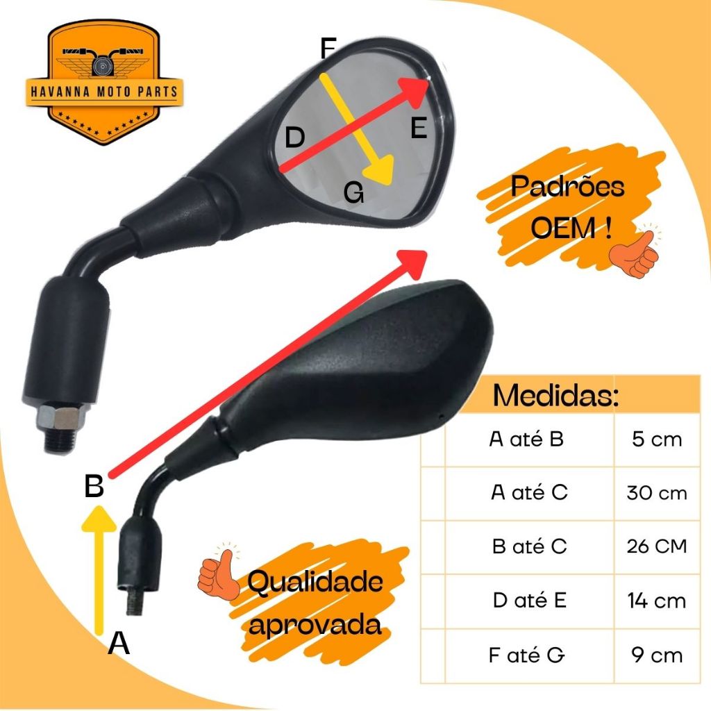 Retrovisor Modelo BMW GS 650 / F 800 - Fixo Rosca P/ Motos Honda (haste fixa) * fotos reais do produto * Conteúdo da Embalagem: - 01 Par de retrovisor para moto (esquerdo/ direito) Alguns Modelos Compatíveis: Cg 125 Titan, Fan Cg 150 Titan, Fan Cg 160 Titan, Fan Xre 190 Nxr 125 Bros Nxr 150 Bros Nxr 160 Bros Xre 300 Cbx 250 Twister, Cb 250f Twister Xre 300 (necessita retirar os adaptadores originais) Cb 300 NX 400 Falcon todos os anos NX 300 Sahara Hornet 2006 a 2015 Pop 100 Biz Todas Pcx 150 Nc 750x e muito mais... OBS: Compatível com motos com encaixe para rosca M10 Atenção: Não serve para motos Yamaha / Não serve para motos BMW. ** ATENÇÃO ** Obs.: Nas motos Honda (acima de 2018), é necessário remover o adaptador de rosca junto com o retrovisor original para a instalação deste produto. Este par de retrovisores em preto fosco, possuem base fixa e hastes no padrão original. São produzidos em plástico ABS e metal de ótima qualidade. Excelente custo-benefício. Compatíveis com motos das linhas Honda, Suzuki e Dafra. Especificações: - Design Original (Foto Real do produto) - Rosca Honda - Produzido em plástico ABS de alta qualidade - Espelho Lente Plana - Rosca com passo de 1.25mm - Dimensões Aproximadas do Espelho (LxA): 13,5x9cm - Haste 9mm - Giro 360° - Comprimento Total Aproximado: 26cm - Instalação Simples - Garante Ótimo Campo de Visão ao Condutor - Encaixe Perfeito IMPORTANTE: - Garantia contra defeitos de fabricação. - Não nos responsabilizamos pelo mau uso do produto. - Recomendamos que a troca/ instalação seja realizada por um profissional qualificado.