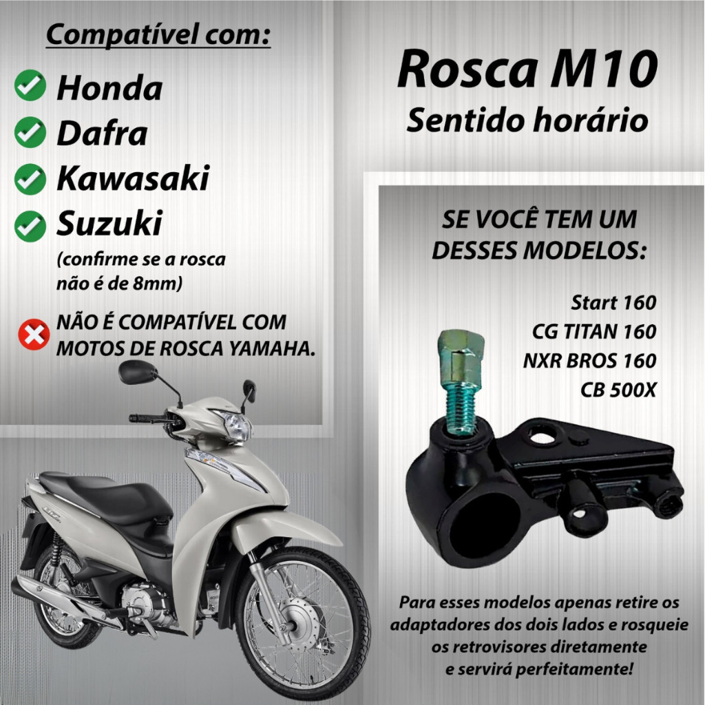 PRODUTO COM NOTA FISCAL, ENVIO IMEDIATO! Lente Convexa. Motos a partir de 2020 retrirar o adaptador de retrovisor. Biz e pop a partir de 2017 retrirar o adaptador de retrovisor. Rosca 10mm sentido horário. Aplicação: Honda (exceto scooter Lead); Kawasaki (exceto scooter); Suzuki (exceto scooter); Dafra (exceto scooter). Diferença da lente plana para a lente convexa: A diferença serve para melhorar o campo de visão do motorista. Espelhos convexos são mais usados para que a área de visão seja ligeiramente ampliada. Especificação Tecnica: Acompanha espelho com lente; Cor preta; Encaixe perfeito; Fácil instalaçã; Haste preta; Maior campo de visão ao condutor; Ótimo acabamento; Produzido com matéria-prima de alta qualidade;