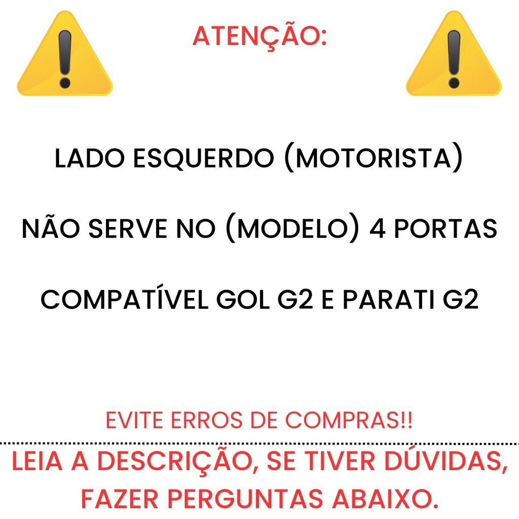 Informações Técnicas: - Espelho Retrovisor Externo Gol G2 ( 2 portas ) - Lado Esquerdo ( Motorista ) - Sem Controle - Lente Metalizada - Cor Preto - Material ( Plástico ) - Produto Novo - Pronta Entrega - Envio Imediato - Gol G2 1995 Até 1999 - Parati G2 1995 Até 1999 Conteúdo Da Embalagem: 1 Retrovisor Externo Lado Esquerdo Características: - Garantia De 90 Dias. - Qualquer situação pode nos chamar, que resolveremos imediatamente. - Material Resistente - Estrutura Reforçada - Excelente Peça De Reparo - Garantia De Durabilidade - Com excelente qualidade e alta tecnologia o produto foi desenvolvido, especialmente para a reposição da peça original danificada ou gasta. Observação: - Todas as informações divulgadas são de responsabilidade do Fabricante/Fornecedor; - Imagens meramente ilustrativas, consulte nosso atendimento para mais detalhes. - Procure sempre um profissional especializado para evitar quaisquer transtornos de instalação.