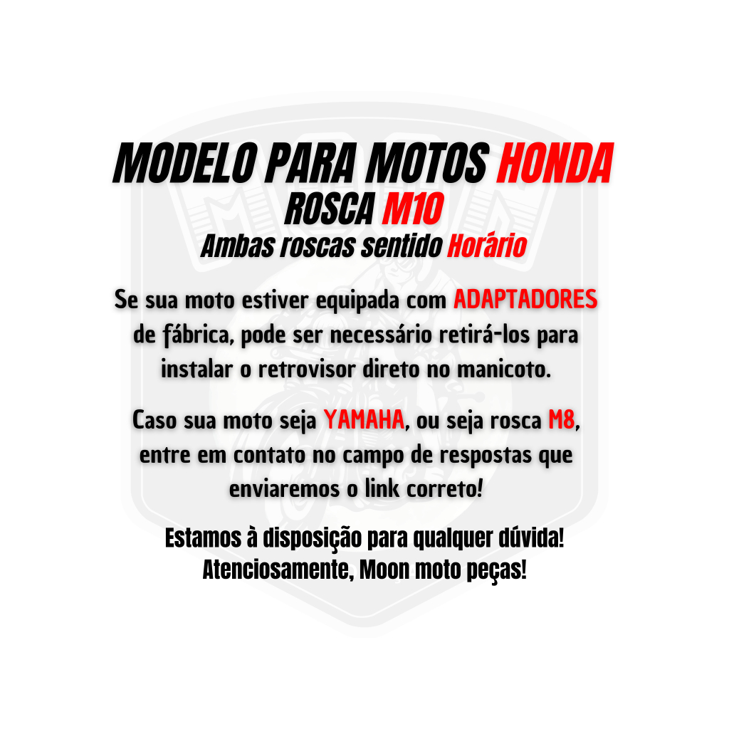 --- EQUIPADO COM LENTE CONVEXA IGUAL MODELO ORIGINAL DE FÁBRICA --- ======================================================================= INFORMAÇÕES IMPORTANTES PARA INSTALAÇÃO NOS MODELOS NOVOS DA HONDA : SE A MOTO POSSUIR ADAPTADOR/ ALONGADOR ENTRE RETROVISOR E MANICOTO RETIRÁ-LO E REALIZAR A INSTALAÇÃO NORMALMENTE DIRETA NO MANICOTO! ======================================================================= DISPONÍVEL ROSCA PADRÃO: - HONDA -- APERTO NO SENTIDO HORÁRIO -- ESPECIFICAÇÕES TÉCNICAS: - Design Original (conforme fotos) - Adaptável todos modelos de moto (Rosca Universal M10) - Fabricado no Brasil - Excelente qualidade - Na Cor preta - EQUIPADO COM LENTE CONVEXA - Maior campo de visão ao condutor - Sistema Fixo - Encaixe perfeito - Fácil instalação - Modelo idêntico ao original (conforme tamanho e peso evitando trepidações) CONTEÚDO da EMBALAGEM: - 1 (um) Par de retrovisor para moto (esquerdo/ direito) IMPORTANTE: - Garantia contra defeitos de fabricação. - Não nos responsabilizamos pelo mau uso do produto. - Recomendamos que a troca/ instalação seja realizada por um profissional qualificado. - Tire todas as dúvidas no campo de perguntas abaixo, temos uma equipe totalmente qualificada a disposição pronta para ajudar. ATENÇÃO! - AS ETIQUETAS DE ENVIO SÃO GERADAS AUTOMATICAMENTE ATRAVÉS DO SEU CADASTRO VERIFIQUE CORRETAMENTE SEU ENDEREÇO PARA EVITAR PROBLEMAS CAUSADOS NA ENTREGA DOS PRODUTOS! OBRIGADO. MOON MOTO PEÇAS.