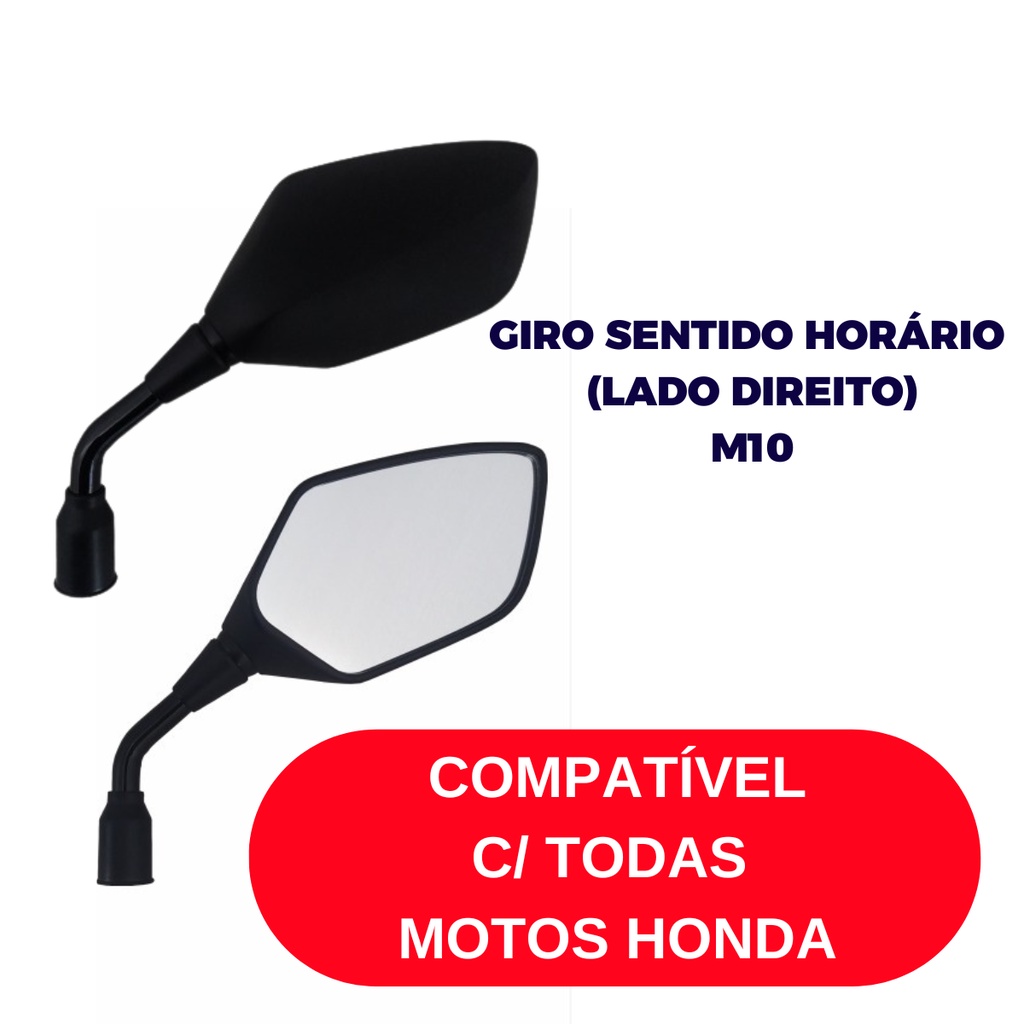 Retrovisor GVS Premium Modelo XRE 300 19-23 Lente Convexa Prata Compatível com todas as Motos de Rosca Honda LANÇAMENTO EXCLUSIVO GVSESPECIFICAÇÕES TÉCNICAS:- Lente convexa Prata;- Maior campo de visão ao condutor;- Adaptável em todos modelos de moto padrão Honda (Rosca Universal M10);- Carcaça e corpo produzido PP na cor preta;- Dimensão e peso similar ao produto original;- Baixo índice de trepidação; Modelos Compatíveis:- CG 150 Fan / Titan / Start;- CG 160 Fan / Titan / Start; - CB Twister;- Falcon;- Qualquer modelo Honda, exceto Scooter PCX/ SH;- XRE sem o adaptadador (também temos a opção original, nos chame nas perguntas e te mandamos o link;OUTRAS INFORMAÇÕES:- Design Original;- Encaixe perfeito;- Fácil instalação;- Excelente qualidade e durabilidade garantida;- Fabricado no Brasil por GVS SPORT que é líder de mercado.CONTEÚDO da EMBALAGEM:- 1 par de retrovisor para moto (esquerdo/ direito).IMPORTANTE:- Produto em estoque, entrega imediata obedecendo os critérios do site;- As etiquetas do envio são geradas automaticamente através do site, por favor verificar seus dados como e-mail e endereço antes de concluir sua compra.ATENÇÃOPara Instalação nos Modelos das Motos Honda 2017-2018 em diante e modelos XRE, caso haja adaptador entre o manicoto e o retrovisor, é necessário retirar o adaptador e instalar o retrovisor diretamente no manicoto. Não nos responsabilizamos pelo mau uso do produto. Recomendamos que a troca e/ou a instalação seja realizada por um profissional qualificado. Em caso de dúvida, entre em contato conosco, nosso time de atendimento está aqui para tirar todas a suas dúvidas! Conte conosco para ter o melhor em sua moto!Equipe MC Motoparts