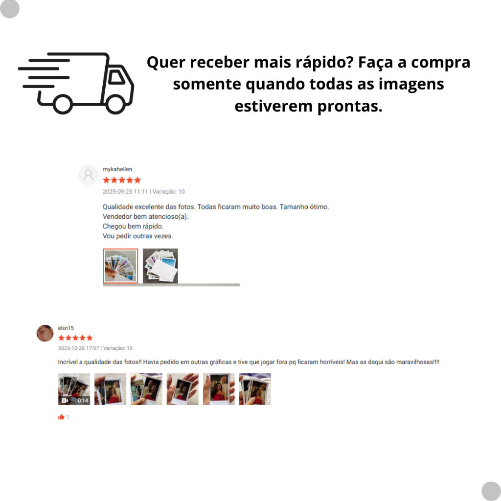 Revelação de Fotos 15x21 cm – Impressão Profissional em até 24h Guarde seus melhores momentos com qualidade fotográfica premium! Fotos reveladas em 15x21 cm, prontas para decorar, organizar álbuns ou presentear. Diferenciais Produção expressa: pedido enviado em até 24 horas após receber suas fotos. Qualidade profissional: papel fotográfico premium + impressão em alta definição (resolução 4K). Cores vivas e durabilidade: tintas originais, acabamento brilhoso de alta definição. Proteção garantida: embalagem reforçada para chegar impecável. Por que escolher nosso trabalho? Utilizamos os melhores materiais do mercado. Revelação em padrão de laboratório profissional. Atendimento rápido e suporte no envio das fotos. Quebras de objeção “Será que a qualidade vai ficar boa?” → Garantimos nitidez com impressão em 4K e tintas originais. “Vai demorar para chegar?” → Produção e envio em até 24h após receber suas imagens. “Não sei como enviar as fotos...” → Você recebe um passo a passo simples no chat. “Pode amassar no transporte?” → Não. Vai em embalagem rígida e protegida. Ficha Técnica Quantidade: conforme variação escolhida no anúncio Tamanho: 15 × 21 cm Material: Papel fotográfico premium Resolução: Impressão 4K em maquinário profissional Envio: até 24h após recebimento das fotos Embalagem: reforçada, protegida contra amassados