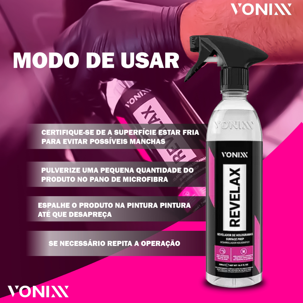Revelaxx evidencia defeitos da pintura, como hologramas e swirls mascarados por ceras, selantes e polidores. É também recomendado para limpeza de vidros e descontaminação de plásticos, principalmente antes da aplicação de V-Plastic, removendo produtos como silicones e contaminações diversas. Seu uso deixa a peça pronta para inspeção antes de qualquer trabalho. Diluição Pronto uso Informações adicionais Revelax pode ser usado para descontaminação de superfícies para vitrificação (plásticos, faróis e vidros), além pode ser usado para limpeza de vidros. -Fácil utilização -Não mancha a pintura -Revela os reis defeitos da pintura Modo de usar 1. Certifique que a superfície está fria, para evitar possíveis manchas 2. Pulverize uma pequena quantidade do produto em uma toalha de microfibra 3. Espalhe o produto na pintura até que desapareça 4. Se necessário repita a operação - Não nos responsabilizamos pela má instalação ou mau uso do produto, faça a instalação com profissionais especializados. - Atenção: As compras realizadas em nome de Pessoa Jurídica estão sujeitas a cobrança de ICMS, conforme Protocolo ICMS 41, de 4 de Abril de 2008. Caso você tenha dúvidas sobre o percentual a ser aplicado, consulte a Cláusula Segunda, §1° do referido Protocolo. - Em caso de dúvidas use o campo de Perguntas. Fotos meramente Ilustrativas. Caso tenha dúvidas quanto a utilização deste produto, favor consulte-nos pelo campo de perguntas. CÓD. REFERÊNCIA: 015299