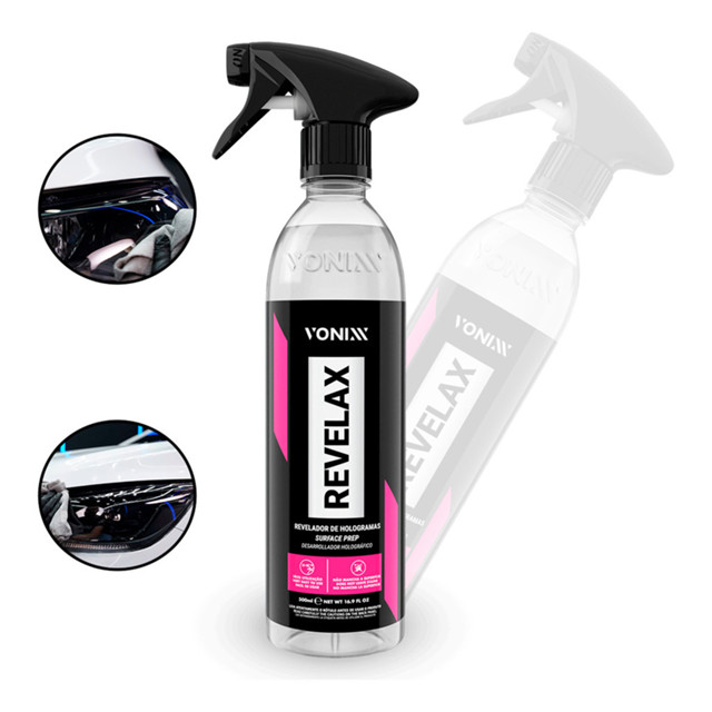 REVELAX VONIXX – A VERDADE DA PINTURA AO SEU ALCANCE O Revelax da Vonixx é o aliado perfeito para quem busca perfeição. Sua fórmula avançada revela defeitos ocultos na pintura, como hologramas e redemoinhos, mascarados por ceras, selantes ou polidores, garantindo uma inspeção precisa antes de qualquer trabalho. Além disso, é ideal para limpar vidros e descontaminar plásticos, faróis e outras superfícies, removendo silicones, resíduos e contaminações com facilidade – o preparo ideal para a aplicação de vitrificadores. Com Revelax, você deixa uma peça impecável e pronta para brilhar de verdade! COMO USAR: 1 - Certifique-se de que a superfície esteja fria para evitar manchas. 2 - Aplique uma pequena quantidade de Revelax em uma toalha de microfibra. 3 - Espalhe suavemente sobre a pintura até o produto desaparecer por completo. 4 - Repita o processo, se necessário, para um resultado impecável. VERSATILIDADE EM AÇÃO: Perfeito para descontaminar superfícies antes da vitrificação (plásticos, faróis e vidros). Excelente para limpeza de vidros, remoção de sujeiras e resíduos com eficiência. VANTAGENS QUE FAZEM A DIFERENÇA: • Praticidade: Fácil de aplicar, sem complicações. • Segurança: Não mancha a pintura, mesmo em superfícies delicadas. • Precisão: Expõe os reais defeitos da pintura para um acabamento perfeito.