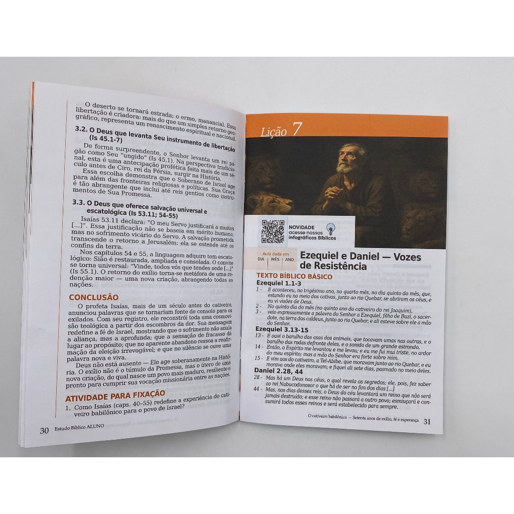 Preparada especialmente para professores da Escola Bíblica, esta revista é um guia completo para conduzir aulas claras, bíblicas e profundamente edificantes. O tema O Cativeiro Babilônico apresenta, de forma organizada e acessível, os acontecimentos que marcaram o exílio de Judá, conectando contexto histórico, revelação profética e aplicação prática para a vida da Igreja hoje. A Revista do Professor vai além do conteúdo do aluno: oferece subsídios teológicos, explicações detalhadas, referências adicionais, orientações pedagógicas e comentários que ajudam o educador a esclarecer dúvidas, contextualizar as lições e ensinar com segurança. É o recurso ideal para quem deseja ministrar com profundidade, clareza e fidelidade bíblica. Ao longo das 13 lições, o professor encontrará bases sólidas para ensinar sobre: queda de Judá, mensagens de Jeremias, visões de Ezequiel, fidelidade de Daniel, edito de Ciro, retorno do povo, ministério de Neemias e Esdras, sempre ressaltando que, mesmo em meio ao juízo, Deus preserva a esperança e cumpre Seus propósitos. Lições: 1 - Quando Judá se afastou de Yahweh 2 – Jeremias e Habacuque — vozes de alerta 3 – Invasões e primeiras deportações 4 – O fim do reino de Judá 5 – O clamor de um povo exilado 6 – Isaías — consolo no exílio 7 – Ezequiel e Daniel — resistência 8 – Louvor em terra estrangeira 9 – Ciro e a queda da Babilônia 10 – Daniel — oração e preparativos 11 – O retorno e a reconstrução do Templo 12 – Neemias e a reconstrução dos muros 13 – Esdras e a restauração pela Palavra Especificações Tecnicas: Formato: 13,5 x 20,5 cm Páginas: 104 Preço: R$ 14,00 SKU: 31785 ISBN: 7898410722581 Diferenciais: Conteúdo ampliado com explicações e comentários exclusivos para professores. Auxilia na preparação de aulas mais profundas, didáticas e contextualizadas. Traz aplicações práticas para fortalecer o ensino bíblico na igreja local. Material oficial do 1º trimestre de 2026, em total alinhamento com a revista do aluno.