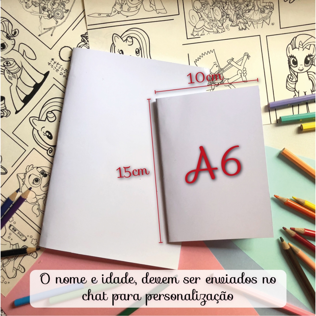 .......................... Tamanho A6 .......................... ✅ CAPA: Papel fotografico glossy 180g ✅ MIOLO: Desenhos e atividades para colorir. ✅ PÁGINAS: 12 folhas de Off-set 90g (mais grossas da shopee) ✅ TAMANHO: Cerca de 10x14,8 cm ✅ JUNÇÃO: Grampeado