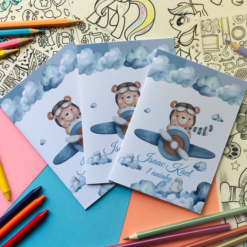 Revistinha de colorir Ursinho Aviador azul lembrancinhas A6 (10x15 cm).