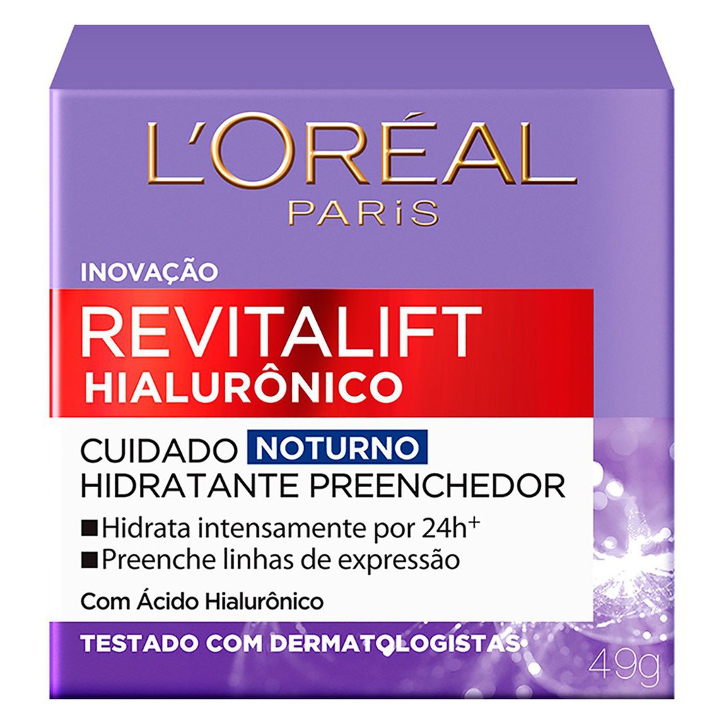 Revitalift Hialurônico Creme Facial Noturno Loréal Paris 49g - 1 Unidade L'Oréal Paris Revitalift Hialurônico Tratamento Noturno hidrata a pele por 24 horas, promove aspecto mais jovem e protege do foto envelhecimento, ajuda a retarda o aparecimento das rugas e diminui as linhas finas. Sua fórmula com ácido hialurônico ainda mantém a pele lisinha e macia. Além disso, possui textura leve e rápida absorção. Benefícios: - Ácido Hialurônico: responsável pela hidratação e elasticidade da pele. - Preenche linhas de expressão. - Pele Tonificada com sensação de hidratada. - Ajuda a revitalizar a pele, tornando visivelmente mais jovem. Como Usar: Aplique de manhã fazendo movimentos circulares ascendentes no rosto e pescoço previamente limpos. Resultado: Sua pele hidratada, macia e visivelmente mais jovem.