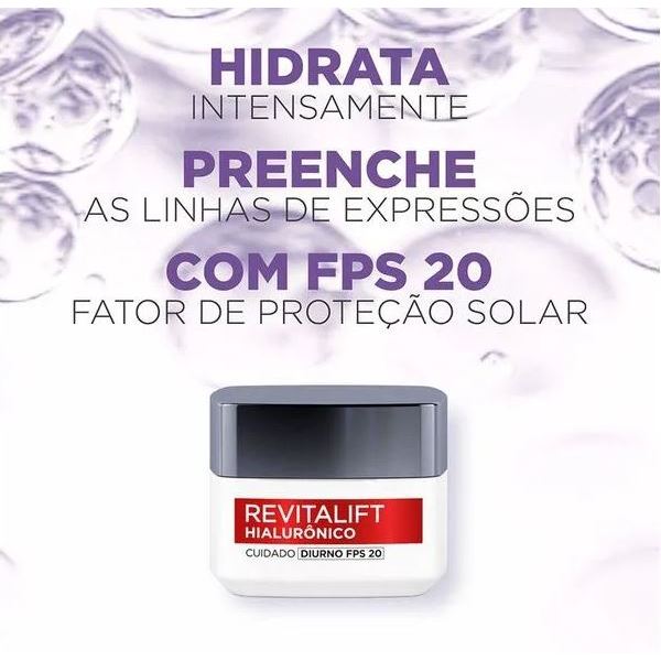 O novo Revitalift Hialurônico Cuidado Diurno com Ácido Hialurônico Puro de L'Oréal Paris é um creme facial com ação antirrugas. Sua fórmula hidrata intensamente a pele por 24h° e preenche as linhas de expressão. Com textura leve, o novo Revitalift Hialurônico é indicado para uso diurno em todos os tipos de pele além de também proteger a pele do fotoenvelhecimento pois possui FPS 20. Sobre o Ácido Hialurônico: A gama completa Revitalift Hialurônico L´Oréal Paris é enriquecida com Ácido Hialurônico puro, componente naturalmente presente na pele e responsável por reter a hidratação, o novo Revitalift Hialurônico hidrata intensamente por 24h, preenche linhas de expressão e revitaliza a pele. Sua textura leve pode ser aplicada em todos os tipos de pele, garantindo uma melhora global em seu aspecto. Testado com dermatologistas. Indicação: Indicado para todos os tipos de pele para tratar as primeiras linhas de expressão. Tecnologia: Ácido Hialurônico: a gama completa Revitalift Hialurônico L'Oréal Paris é enriquecida com Ácido Hialurônico puro, substância produzida naturalmente pelo organismo e presente na pele, mas a sua produção decai com o passar dos anos. Possui um alto poder preenchedor, capaz de manter até 1000x o seu peso em água hidratando e preenchendo a pele, devolvendo a vitalidade e combatendo linhas de expressão. Não agride a pele, leve como água. Benefícios: • Em um dia: Sensação de pele hidratada e mais macia. • Em 8 semanas: Pele visivelmente mais jovem. Rugas menos visíveis. Modo de Uso: Aplicar durante o dia fazendo movimentos circulares ascendentes no rosto e pescoço previamente limpos. Manter fora do alcance de crianças. Se observar qualquer reação adversa, suspender o uso. Se persistir, consulte seu médico.