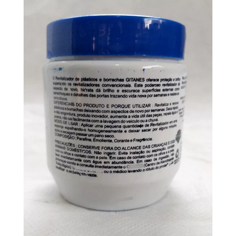 Revitalizador de Plásticos e Borrachas carros, Motos, Vans e Utilitários; . ONDE UTILIZAR - Plásticos e Borrachas Automotivas; - Forros de Portas Automotivas Internas; - Carenagem plástica de Motopeças e Carros; - Carenagem plástica de Faróis de Moto; - Baús de Moto; - Para-choques Automotivos; - Laterais Plásticas de carros, Motos, Vans e Utilitários; . DESCRIÇÃO - Revitaliza e Renova Plásticos e Borrachas automotivas; - Devolve o Aspecto de novo por Semanas; - Secagem Rápida e não engordura; - Produto Inovador; - Aumento de Vida útil das Peças; - Repelente á Água e Poeira; - Não sai com Lavagem ou Chuva; - Embalagem - Plástica; - Quantidade - 200g; - Altura - 8 CM; - Largura - 7CM; . O revitalizador de Plásticos e Borrachas GITANES Oferece Proteção e Brilho Superando os Revitalizadores Convencionais. Este Poderoso Revitalizador dá aspecto de Novo, Hidrata dá Brilho e escurece Superfícies externas Como Para - choque e detalhes das portas trazendo Vida nova por semanas e resiste ao sol e Chuva; . MODO DE USAR - Aplicar uma Pequena quantidade de Revitalizador em uma esponja espalhando homogeneamente e deixar secar por alguns Minutos, Após a Secagem passar um pano seco e está pronto; .