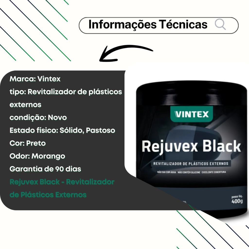 | Revitalizador de Plásticos Externo Rejuvex Black 400g Vintex este produto | R$ 35,97 | 32% | 5.0/5 | — |