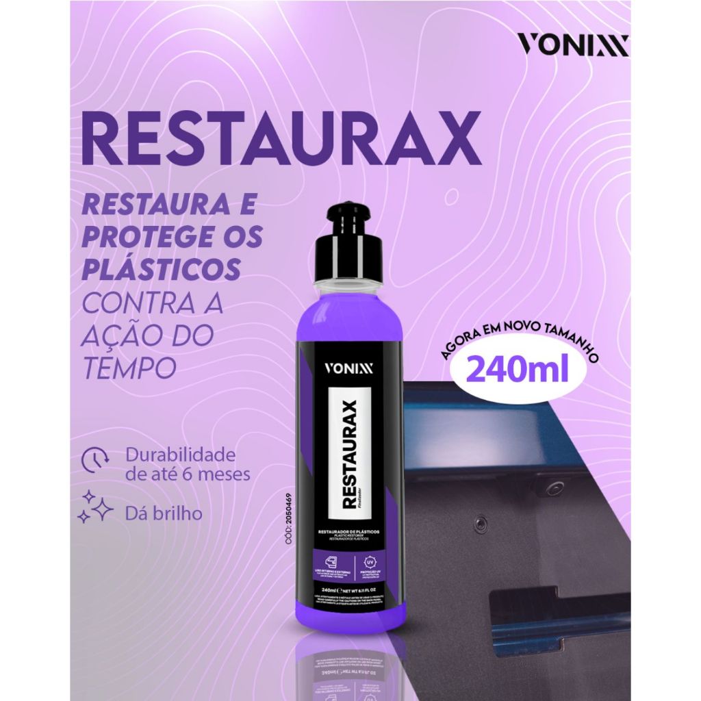 RESTAURAX 240ML - RESTAURADOR DE PLÁSTICOS DESCRIÇÃO: Restaurax renova e restaura superfícies plásticas, como para-choques, painéis e laterais de portas. Sua fórmula contém polímeros especiais que também protegem as peças contra as ações do tempo, evitando degradação precoce do material. DURABILIDADE: Até seis meses de proteção nos plásticos internos e sessenta dias nos plásticos externos. MODO DE USO: 1. Limpar bem a superfície e em seguida aplicar o produto com um aplicador de espuma até a completa restauração. Se necessário, repetir a operação. 2. Para manter o plástico sempre novo, repetir a aplicação do produto a cada 60 dias na parte externa e a cada 6 meses na parte interna. Obs: Para um resultado com menos brilho, realizar acabamento com um pano de microfibra.