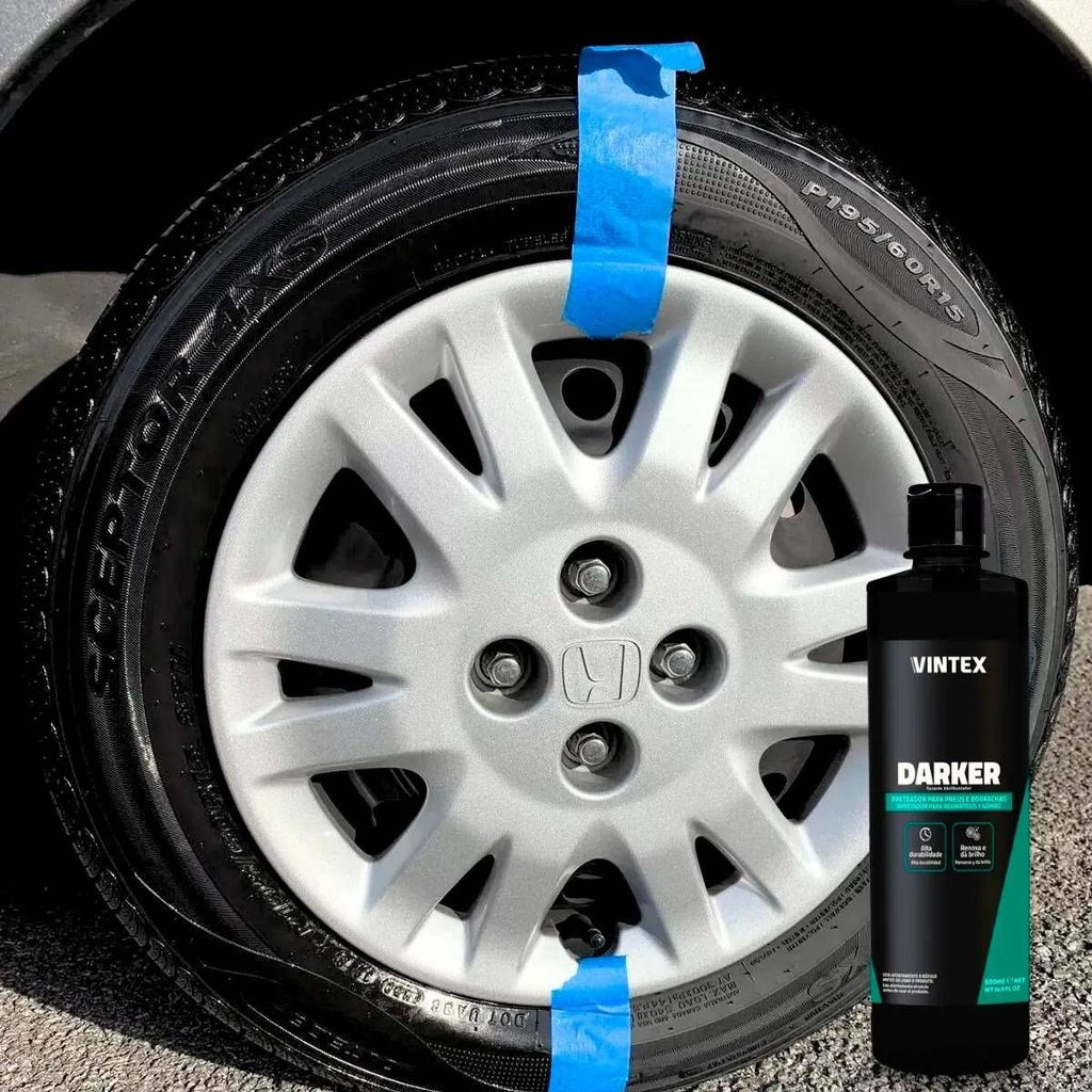 DARKER 500ML VINTEX DESCRIÇÃO: DARKER foi desenvolvido para renovar e dar brilho em pneus e borrachas em geral, especialmente em caminhões. O produto forma um filme preto, sólido, semi-flexível e de alta resistência, promovendo alta durabilidade. MODO DE USAR: 1 - Limpe e seque bem a superfície; 2 - Agite bem o produto antes de usar; 3 - Com o auxílio de uma trincha ou pincel, aplique o produto uniformemente no pneu ou borrachas em geral e aguarde secar por 30 minutos; 4 - Caso queira mais brilho, uma segunda demão poderá ser aplicada após 30 minutos.