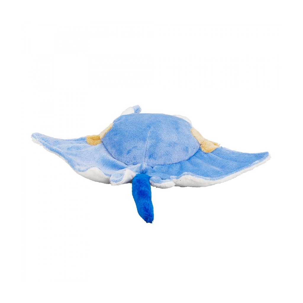 Bichinho de pelúcia no formato de um raia azul com 28 cm de largura. Olhos de plástico. Material: poliéster; Enchimento: fibra de poliéster; Produto certificado por Órgão acreditado pela CGCRE do INMETRO