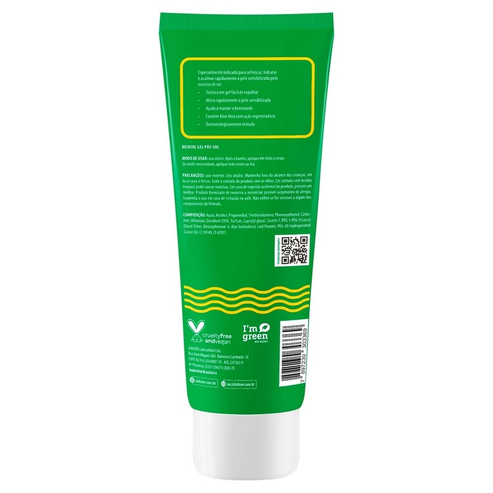 Pós-Sol Gel Hidratante Ricosol Bisnaga 120g Especialmente indicado para refrescar, hidratar e acalmar rapidamente a pele sensibilizada pelo excesso de sol.Textura em gel fácil de espalhar. Alivia rapidamente a pele sensibilizada. Ajuda a manter o bronzeado. Contém Aloe Vera com ação regeneradora. Dermatologicamente testado.