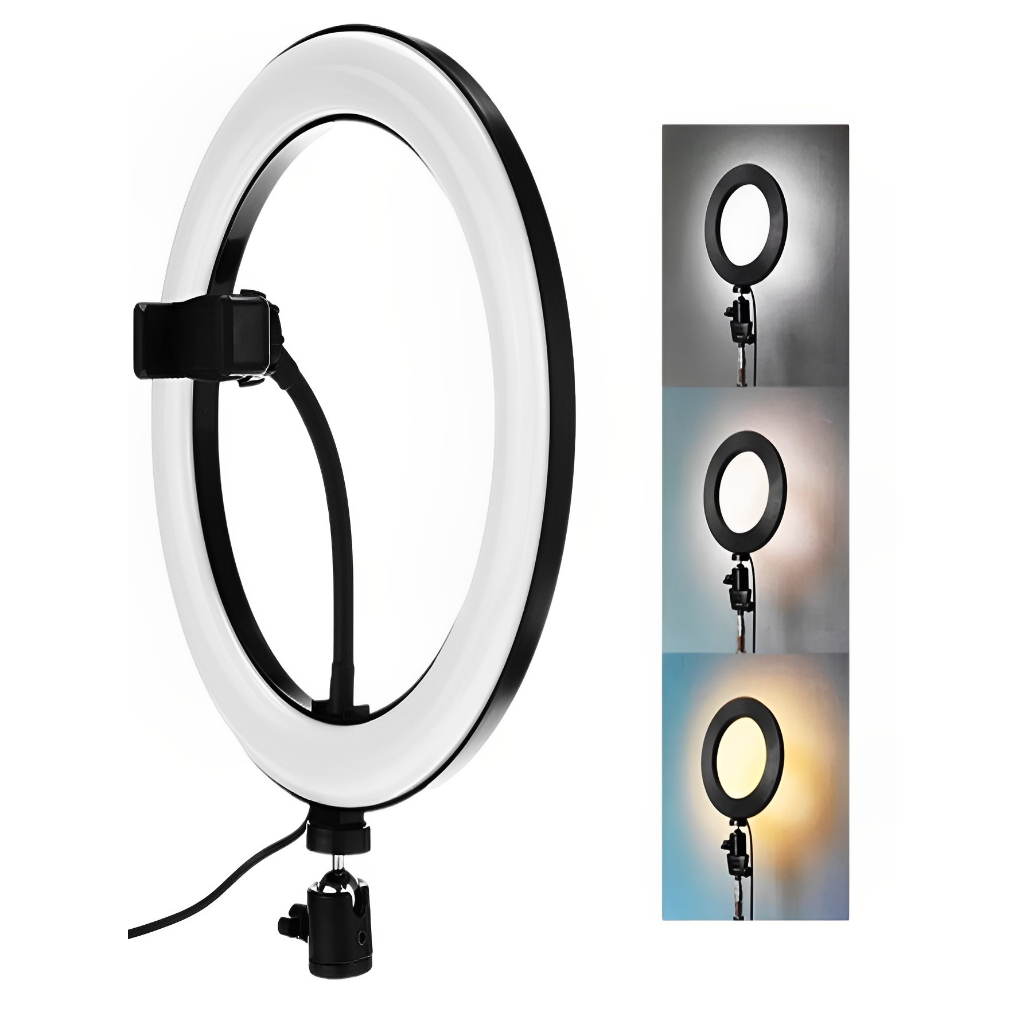 DESCRIÇÃO DO PRODUTO: Iluminador de LED Ring Light - 12 polegadas (30cm), é indicado para profissionais no ramo da beleza, como maquiadores e cabeleireiros, ou para fotógrafos que buscam ampliar a iluminação de seus estúdios fotográficos, sendo muito utilizado para criação de fotos de produtos, devido a sua iluminação fiel às cores, Desenvolvido para maquiadores, fotógrafos, cinegrafistas, amadores e etc, que buscam uma ótima maneira de iluminar com perfeição. É possível controlar as diferentes temperaturas de cores através do controle de ajuste que vai de 3500k à 5500k. Na frente dos leds tem um filtro difusor para suavizar a luz "espalhando" a luz com maior uniformidade, a alimentação do iluminador é através de cabo USB. Pode ser ligado na caixinha carregadora de qualquer celular , bateria portátil, computador ou qualquer item com usb, Suporte para celular que pode ser usado na vertical e horizontal, é recomendado e extremamente eficaz para a macro fotografia, fotografia médica, odontológica, científica, hobby e para a iluminação/fotografia de produções de maquiadores, estética, Youtubers entre outros. CARACTERÍSTICAS: * 3 Tipos de cores: Branco frio, branco neutro e branco quente; * Entrada do produto USB é compatível com fonte de celular. Embalagem contém: * 1 - Ring Light 12" (30cm); * 1 - Suporte de Celular * 1 - Controle de intensidade de iluminação acoplado no cabo de força * com os 3 tons de luz em 1