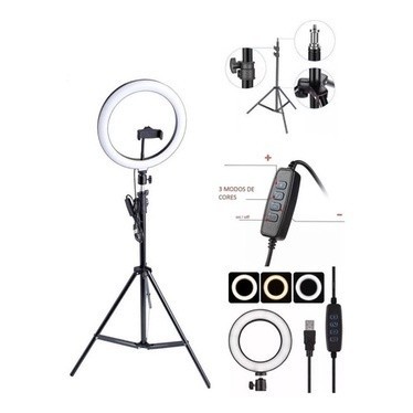 Ring light para gravações e selfies. Suas fotos e vídeos com qualidade profissional! A Ring light 26CM / 10 polegadas polegadas possuí controle integrado ao próprio cabo USB que regula os tons de cores da luz (são 3 tons. amarelo, branco frio e branco com amarelo). A Ring light possuí uma haste flexível (suporte de celular) ao meio do LED para prender o celular, proporcionando conforto para bater suas fotos e vídeo tanto verticalmente, horizontalmente, pra cima ou para baixo, por ser flexível você pode deixar na posição desejada! Além de um excelente Ring Light você também vai ter um tripé Profissional com altura máxima de 2,10m e minima de 65 cm *ATENÇÃO* A RING LIGHT SEGUE ACOMPANHADA DE: 1- tripé com altura máxima de 2,10m e mínima de 65 cm 1- aro circular Ring light 26Cm 1- haste flexível 1- fio USB 1- controle de tom da luz integrada ao próprio fio USB ATENCAO: - Ring light funciona por corrente direta ( precisa conectar a tomada para funcionar) -Ring light acompanha cabo usb NÃO acompanha carregador/tomada -Use um carregador/fonte de celular com porta USB unico de 5v=2.1A não use fontes com carregamentos rápido SIGA as especificações indicadas para garantir o bom funcionamento e duração do led ATENÇÃO * fontes de samsung ou apple NÃO use, sao as fontes que mais tentam usar e NÃO possui as indicações recomendadas!