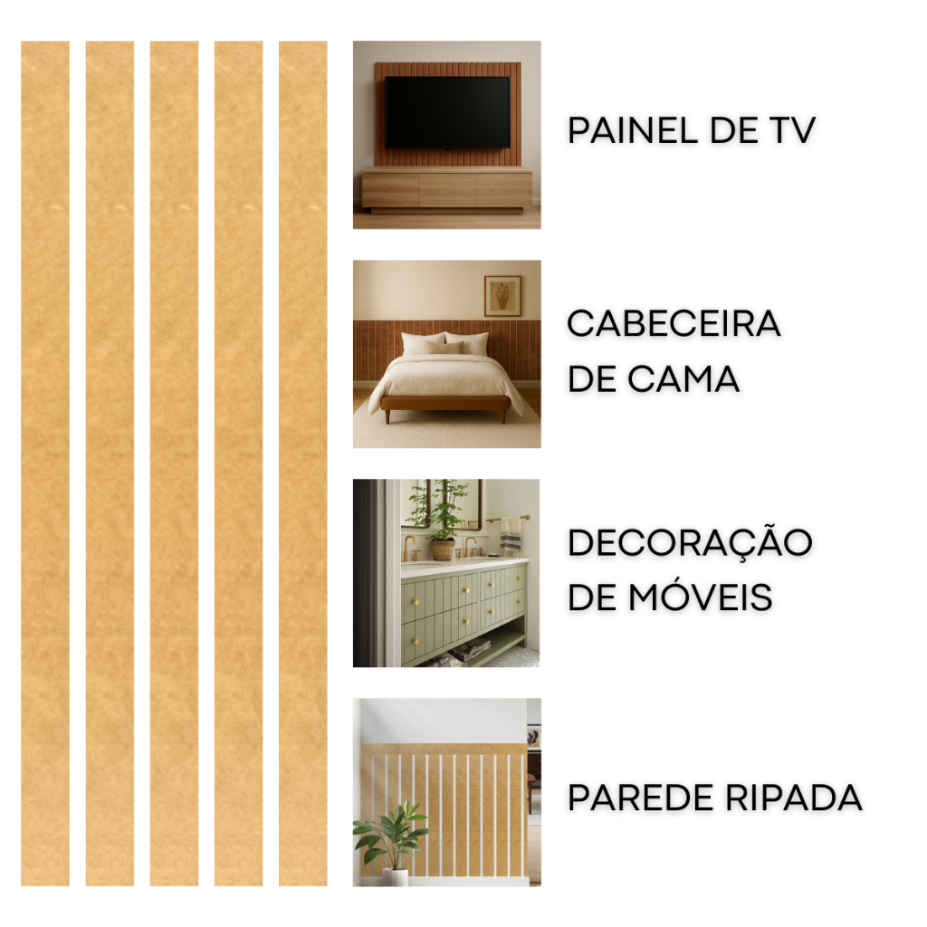 Transforme qualquer parede em minutos com um painel ripado moderno, personalizável e com visual premium sem quebra-quebra, sem sujeira e sem interromper sua rotina. O Kit acompanha 20 ripas de MDF cru 3 mm e permite composições sob medida para salas, quartos, home office, recepções e ambientes comerciais. Resultado elegante, rápido e com custo de reforma sob controle. Ideal para quem quer elevar o padrão estético do ambiente com praticidade. - Principais benefícios (o que você ganha) Acabamento moderno sem obra: instalação com fita dupla face de alta aderência ou cola para MDF. Personalização total: pinte ou envernize na sua paleta (tintas à base d’água recomendadas) e crie um visual autoral. Impacto imediato: ritmo visual que traz profundidade, sensação de amplitude e aconchego. Versatilidade real: layouts vertical, horizontal ou misto; combina com iluminação indireta, plantas e móveis. Uso amplo em interiores: salas, quartos, cabeceiras, home office, recepções, vitrines e ambientes comerciais. Visual fotogênico: ideal para fotos, vídeos, vitrines e cenários de atendimento. Instalação limpa e rápida: sem barulho, sem poeira, sem equipe de obra. - O que vem no Kit 20 ripas de MDF cru Espessura: 3 mm Comprimento: 90 cm Larguras versáteis para composições sob medida: 3 cm, 5 cm, 10 cm Superfície crua para receber tinta/verniz e revelar a textura do MDF Observação: personalize as ripas antes de aplicar na parede para um acabamento mais uniforme e protegido. - Como instalar (4 passos simples) Planejamento do layout Defina vertical (sensação de altura), horizontal (alongamento) ou misto (efeito autoral). Marque linhas-guia com nível e fita crepe para manter o alinhamento. - Preparação das ripas Lixe levemente as bordas, remova pó. Aplique tinta à base d’água ou verniz e aguarde a cura conforme o fabricante. - Fixação sem obra Aplique fita dupla face de alta aderência no verso da ripa (linhas verticais) ou use cola indicada para MDF. Pressione na parede por alguns segundos, seguindo as linhas-guia. - Acabamento Ajuste espaçamentos (ex.: 1 a 2 cm) para criar ritmo e respiração visual. Instale iluminação indireta próxima para valorizar o relevo. - Dicas de pro: teste o padrão no chão antes de fixar; comece pelo centro da parede para simetria; esconda tomadas com um recuo de ripa se necessário. - Onde usar (e por que funciona) Salas e home theater: cria fundo elegante para TV e iluminação. Quartos e cabeceiras: traz acolhimento e textura para o ambiente. Home office: cenário profissional para reuniões e conteúdo. Recepção e ambientes comerciais: presença estética que comunica valor. Vitrines: destaque de produtos com textura e ritmo visual. - Por que não deixar para depois Paredes lisas passam frieza e pouca personalidade. Reformas tradicionais geram sujeira, barulho e custos de mão de obra. Soluções improvisadas descolam e não entregam padrão de acabamento. Cada dia sem decidir é um dia em um espaço que não representa seu bom gosto (nem valoriza o negócio). Com este kit, você tem impacto visual de alto nível, rapidez na execução e controle de custos. - Especificações técnicas Material: MDF cru Espessura: 3 mm Comprimento: 90 cm (por ripa) Larguras disponíveis: 3 cm, 5 cm, 10 cm Aplicação: ambientes internos e secos Fixação: fita dupla face de alta aderência ou cola indicada para MDF Acabamento: tinta à base d’água ou verniz - Como estimar cobertura (exemplo prático) Para calcular a largura total coberta, some as larguras das ripas que você pretende usar. Fórmula: Largura coberta = (soma das larguras das ripas) em centímetros Altura coberta: 90 cm Exemplo ilustrativo: se você montar um painel com 60 ripas de 5 cm de largura, terá 300 cm (3 metros) de largura por 90 cm de altura. Ajuste o cálculo conforme a combinação de larguras (3, 5 e 10 cm) e o espaçamento entre ripas. Observação: a composição do seu layout (e o espaçamento entre ripas) influencia a área total coberta. - Perguntas frequentes ? Posso pintar? Sim. Recomenda-se tinta à base d’água ou verniz. Pinte antes da instalação para um acabamento mais uniforme. Pode usar em áreas úmidas? Não é indicado para áreas molhadas ou úmidas. Use apenas em ambientes internos e secos. Fita dupla face ou cola? Ambos funcionam. Fita de alta aderência agiliza e mantém a instalação limpa; cola específica para MDF oferece fixação forte (siga as instruções do fabricante). Dá para remover depois? Sim, mas a remoção pode danificar a pintura da parede. Aquecer a fita com secador ajuda a soltar; retoques podem ser necessários. Como manter/limpar? Pano seco ou levemente umedecido; evite excesso de água e produtos abrasivos. Posso misturar larguras? Sim. Combinar 3 cm, 5 cm e 10 cm cria ritmo e um visual autoral. Preciso de mão de obra? Não necessariamente. Com planejamento, uma pessoa instala. Para paredes grandes, duas pessoas agilizam e melhoram a precisão.