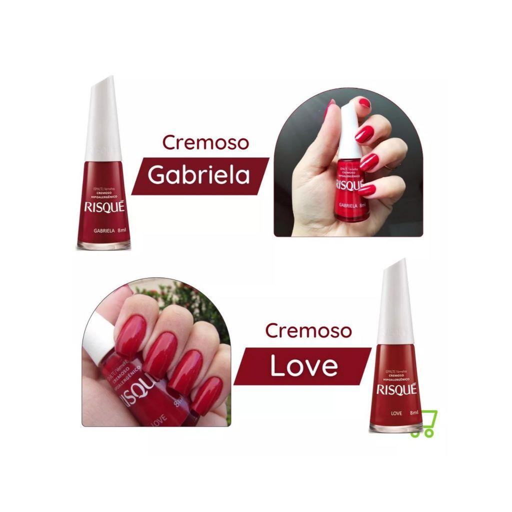 Bem vindos (as) à NOVAMIX!! Trabalhamos com muita dedicação e carinho para atender as suas expectativas. Todos os nossos produtos são originais, com emissão de nota fiscal e validade prolongada. Pedimos que leiam atentamente a descrição do anúncio, mas se mesmo assim ainda ficou com dúvidas, será um prazer te ajudar. Risqué: Kit com 10 Esmaltes Hipoalergênicos Gabriela Love Carmim Hoje Só Volto Amanhã Doce Orgulho Escarlate Maça do Amor Rubi Licor Rebu ** DÚVIDAS FREQUENTES ** 1- Quais são as cores do kit? As cores são iguais as da primeira imagem do anúncio, podendo haver substituições conforme disponibilidade de estoque. 2- Posso escolher as cores do Kit? Não é permitida a escolha das cores. 3- Qual a validade dos esmaltes? Validade mínima de 24 meses. Agradecemos a sua visita!! NOVAMIX Comercial