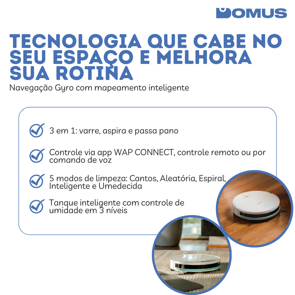 ***PRODUTO A PRONTA ENTREGA COM ENVIO IMEDIATO*** PRODUTO ORIGINAL COM NOTA FISCAL O Robô Aspirador WAP ROBOT W1000 é a solução 3 em 1 que varre, aspira e passa pano com eficiência, praticidade e tecnologia. Equipado com navegação inteligente Gyro, ele realiza o mapeamento do ambiente em tempo real, evitando obstáculos e otimizando o trajeto de limpeza. Design slim, acabamento em vidro e rodas emborrachadas, é ideal para casas com pets e diferentes tipos de pisos. O recipiente 2 em 1 permite armazenar água e pó, e o tanque inteligente regula automaticamente a liberação de água em 3 níveis de umidade, garantindo uma limpeza completa e sem excesso. Especificações técnicas: Modelo: ROBOT W1000 Código: FW010142 Potência: 24W Voltagem do carregador: Bivolt automático Autonomia: até 2h40 Conectividade: Wi-Fi, compatível com Alexa e Google Assistente Aplicativo: WAP CONNECT (Android/iOS) Reservatório: 2 em 1 (água e pó) Modos de limpeza: 5 modos Sucção: 3 níveis ajustáveis Sistema de navegação: Gyro com mapeamento Sensores: anticolisão, antiqueda e redirecionamento Cor: Preto com acabamento em vidro Conteúdo da embalagem: 1 Robô Aspirador WAP W1000; 1 Controle remoto; 2 Escovas laterais; 1 Reservatório 2 em 1 (água/pó); 1 Base carregadora; 1 MOP de limpeza; 1 Manual do usuário. Transforme sua rotina com o Robô Aspirador WAP W1000 e tenha sua casa sempre limpa, sem esforço e com tecnologia de ponta ao seu lado!