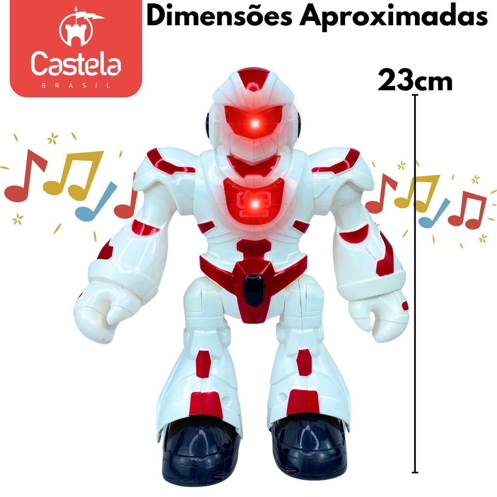 DESCRIÇÃO DO PRODUTO: O Robô Brinquedo Infravermelho da Castela é a diversão garantida para crianças que adoram tecnologia e interação! Este robô incrível não só se movimenta, como também dança, gira e emite sons e luzes coloridas, proporcionando uma experiência cheia de energia e diversão. - Movimento e dança: O robô se move para frente, para trás e pode realizar movimentos de dança que encantam. - Tecnologia de infravermelho: Controle remoto para fácil interação e controle dos movimentos do robô. - Sons e luzes: Emite sons divertidos e luzes coloridas, tornando as brincadeiras ainda mais dinâmicas e interessantes. Adquira o seu Robô Castela e leve para casa um brinquedo tecnológico que vai fazer a diversão dos pequenos (e até dos grandes também)! CARACTERÍSTICAS TÉCNICAS: Conteúdo da Embalagem: 1 Robô Brinquedo Infravermelho Dança Gira Se Movimenta C/ Sons & Luz - Castela Dimensões Aproximadas do Produto: 23cm Dimensões Aproximadas da Embalagem: 12 cm x 27 cm x 28 cm (Altura x Largura x Comprimento/Profundidade) Material/Composição: Plástico Idade Mínima Recomendada: A partir de 6 anos Participantes: A partir de 1 pessoa Alimentação: Requer 3 Pilhas AA 1,5v (Não Incluídas) Marca: Castela Outras informações: As cores podem variar entre as imagens mostradas acima e o produto. Imagens meramente ilustrativas. Aviso: As informações e imagens divulgadas são de total responsabilidade do fabricante/fornecedor. Produto lacrado e disponível a pronta entrega para todo Brasil! APROVADO PELO INMETRO