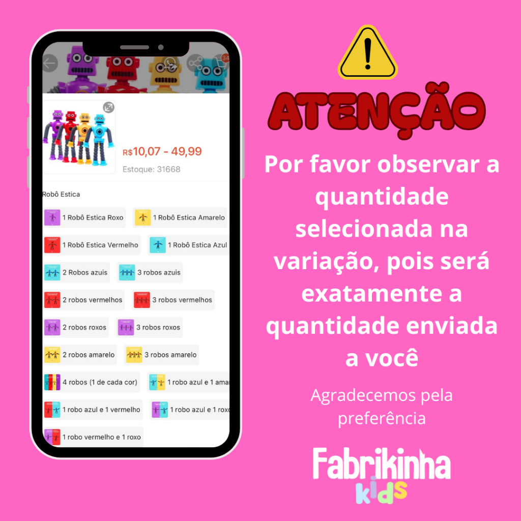 ROBÔ ESTICA O brinquedo sensação do TIK TOK acaba de chegar no Brasil. Pop Tube de Robô com Luz e Ventosa é Super Atrativo e Envolvente para os Pequenos, desenvolvendo a criatividade! O brinquedo possibilita várias formas de brincar e se divertir e garante horas de entretenimento saudável. CARACTERÍSTICAS DO POP TUBE ROBÔ: - Brinquedo com Luz. - Tamanho máximo: 40cm - Tamanho Mínimo: 18cm - Cores para Meninos: Azul e/ou Amarelo - Cores para Meninas: Vermelho e/ou Roxo - Quantidade: FAVOR OBSERVAR A QUANTIDADE QUE ESTÁ SELECIONANDO!! TEMOS A OPÇÃO DE COMPRAR A UNIDADE AVULSA, KIT COM 2 UNIDADES E KIT COM 4 UNIDADES. - - IDEAL PARA CRIANÇAS ACIMA DE 3 ANOS. Todos os produtos são testados antes de enviarmos para sua residência =) Em caso de dúvidas, por favor, entre em contato conosco através do chat. Em caso de problemas no fornecimento, por favor, entre em contato através do link do seu pedido.