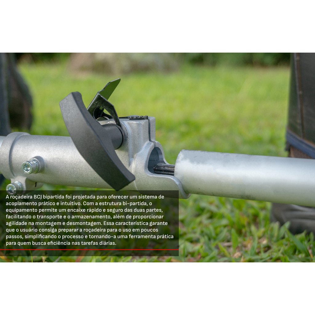 Com motor de 52,7 cc, haste bipartida e guidão ergonômico, é ideal para corte de vegetação densa mais resistentes e arbustos. Alta potência e excelente desempenho para corte de diversos tipos de vegetação. Código: 43-01179 Modelo: BCJ 521-LS Diâmetro das lâminas: 305 mm Vela de ignição: Kawashima KNP6Y e NGK BPM6A (Modelos recomendados para reposição) Diâmetro da haste: 26 mm Tipo do motor: Monocilíndrico, 2 tempos, refrigerado a ar, gasolina Lubrificante da caixa de transmissão: Graxa mineral NGLI 2 - (90 g) Diâmetro do fio de nylon: 2,5 mm ( Modelos recomendados para reposição.) Filtro de ar: Seco Sistema de ignição: CDI Capacidade do tanque de comb.: 1250 ml Cilindradas: 51,7 cc Combustível:Mistura de gasolina comum + óleo para motor 2 tempos (25:1) Espessura da lâmina: 2,0 mm Diâmetro do encaixe da lâmina: 25,4 mm Diâmetro x curso: 44 x 34 mm Sistema de partida: Manual (autorretrátil), com sistema easy start (partida fácil) Tipo de carburador: Diafragma, com regulagem Eixo cardã: 7 x 7 Motor: Kawashima G2M 52 Embreagem: Centrífuga, aço sinterizado Tipo: Roçadeira a gasolina, 2T, lateral com guidão e haste bipartida Peso líquido: 7,98 kg (s/ acessório de corte) Garantia: 90 dias concedido pelo fabricante.