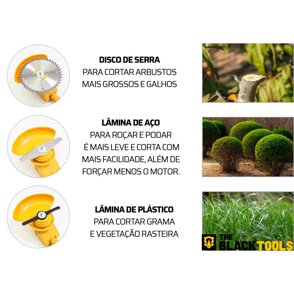 A The Black Tools é uma marca comprometida com a qualidade e as necessidades do cliente. Nosso objetivo é oferecer as melhores soluções para o seu dia a dia, com um design funcional e inovador. ROCADEIRA A BATERIA 21V BIVOLT TCG21C - The Black Tools A Roçadeira a Bateria 21V The Black Tools TCG21C é uma ferramenta indispensável para quem procura leveza e desempenho na jardinagem; Oferecendo praticidade e facilidade de uso, sendo ideal para quem deseja manter seu jardim limpo e organizado. VANTAGENS: - Com a borda da proteção da grama, impedindo que a grama salpicos durante a utilização; - Design sem fio, baixo consumo de energia e baixo nível de ruído; - Produto leve, ajudando na praticidade e eficiência do serviço; CARACTERÍSTICAS: - Contém conjujnto de lâminas; - Com trava de segurança; - Com ajuste de posição; - Bateria de 2000 mAh; - Com cabo regulável; ITENS INCLUSOS: - 01 Lâmina disco 40 dentes; - 05 Lâminas de plástico; - 02 Lâmina de metal; - 01 Carregador; - 01 Bateria 21V; FICHA TÉCNICA: - Diâmetro de corte: 25cm; - Velocidade: 6000rpm; - Potência: 750W; Marca: The Black Tools Modelo: TCG21C Dimensões (CxLxA): 91x9x16cm Peso: 2.40kg Garantia: 06 Meses SKU: 24252